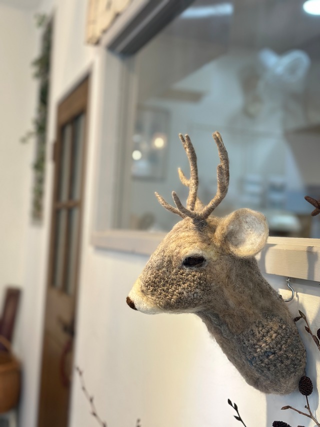 49.エゾシカ Yezo deer ナカノイクコ Ikuko Nakano 壁掛け 動物造形作家 ナカノイクコ制作 エゾシカ (アニマルヘッド) ピン等で壁に掛けインテリアとしてお楽しみいただけます。 *画像は立てかけています。 綿を摘み、羊の原毛から糸を紡ぎ、 草木で染められて生まれた動物たち。 Size(cm): W10 H6 D17 素材: ・羊毛(国産) ・綿 ・押出法ポリスチレンフォーム ・ワイヤー ・樹脂製さし目 なかのいくこさんの創る動物は、 素材はストーリーから、 造形は観察から、 瞳は愛情から、 繊維の景色は表現の感性から生まれました。 なかの いくこ プロフィール 育てるつくる「ながいぬ屋」 羊の原毛を洗い植物で染め紡いだ糸、棉花を育て紡ぎ-草木染をした綿糸を素材として動物たちを制作。 見てくださった方の気持ちが「優しい」や「穏やか」など緩やかに変化してほしいなと思って制作しております。 言葉で伝えるのは難しいので、ぜひ作品達に会いに来てください。 なかのいくこ ●全て一点、一点、手作りのため採寸の若干の誤差、またお持ちのスクリーンによって色等の見え方が異なります。ご容赦ください。 ●基本的に返品はお断りさせていただいております。気になる点がございましたら、ご購入の前に気軽にお尋ねください。 ●実店j舗と併売しているため、タイミングによっては、注文確定後でも売約となる場合がございます。