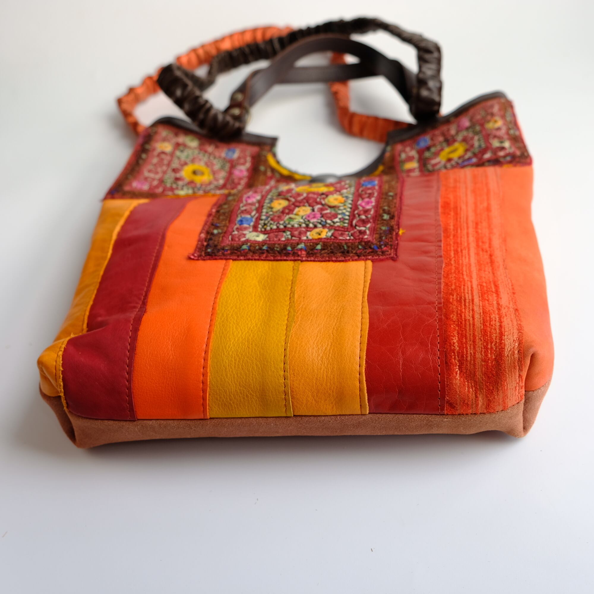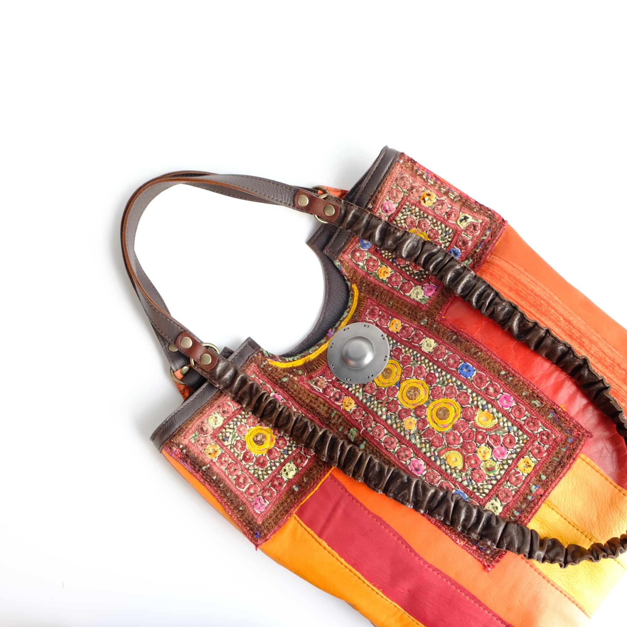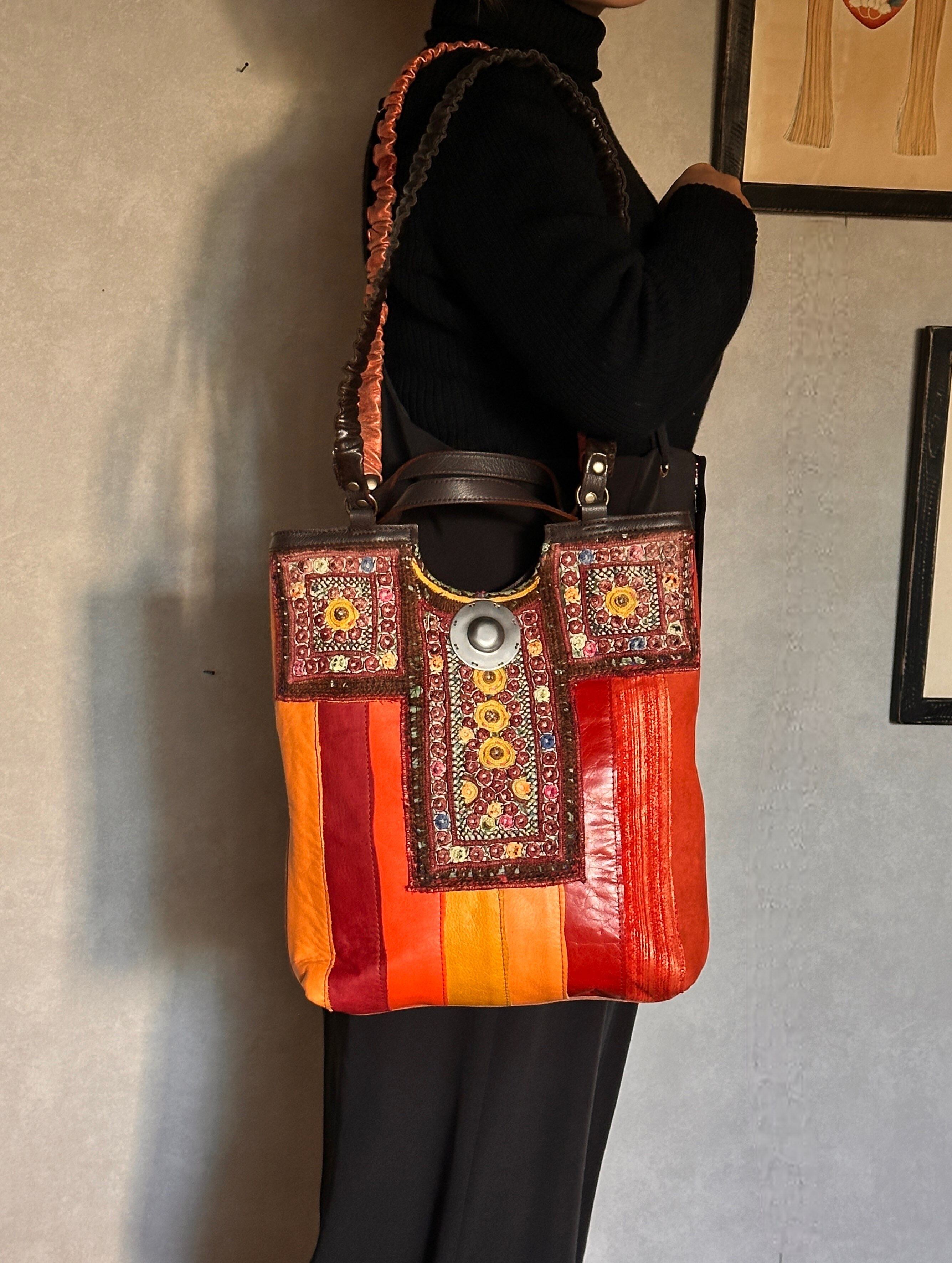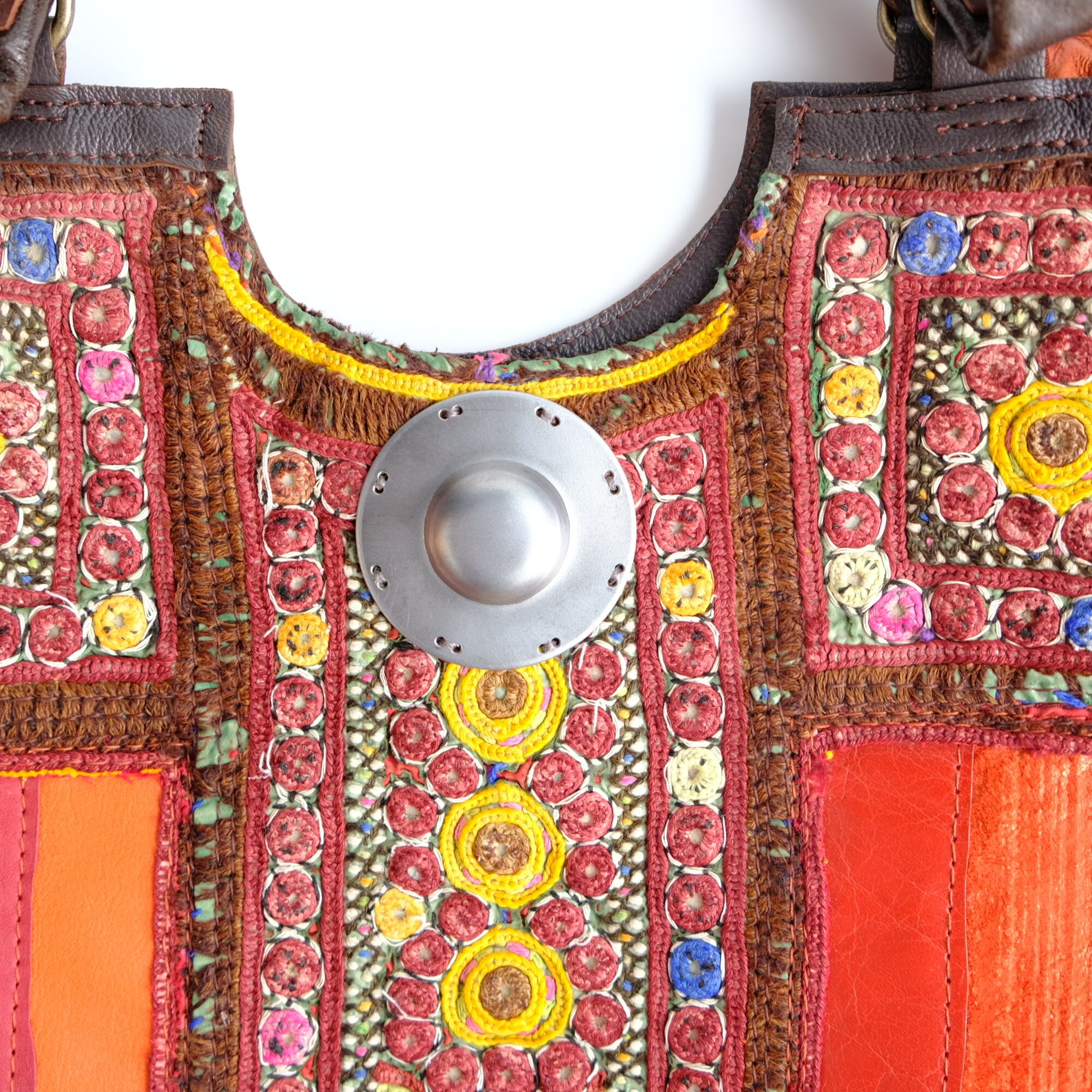 ビビッドカラーを基調にしたレザーパッチワーク、アフガニスタンの刺繍古布、タイのエクステリア用装飾金具がポイントです。