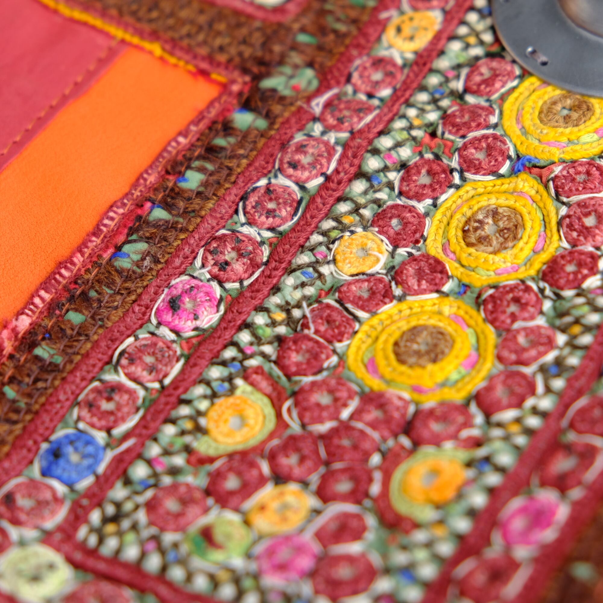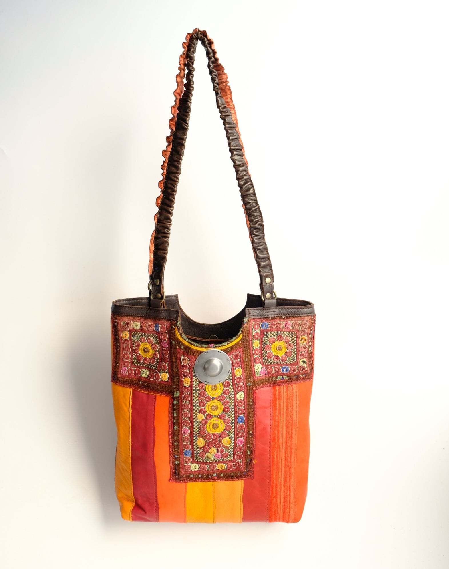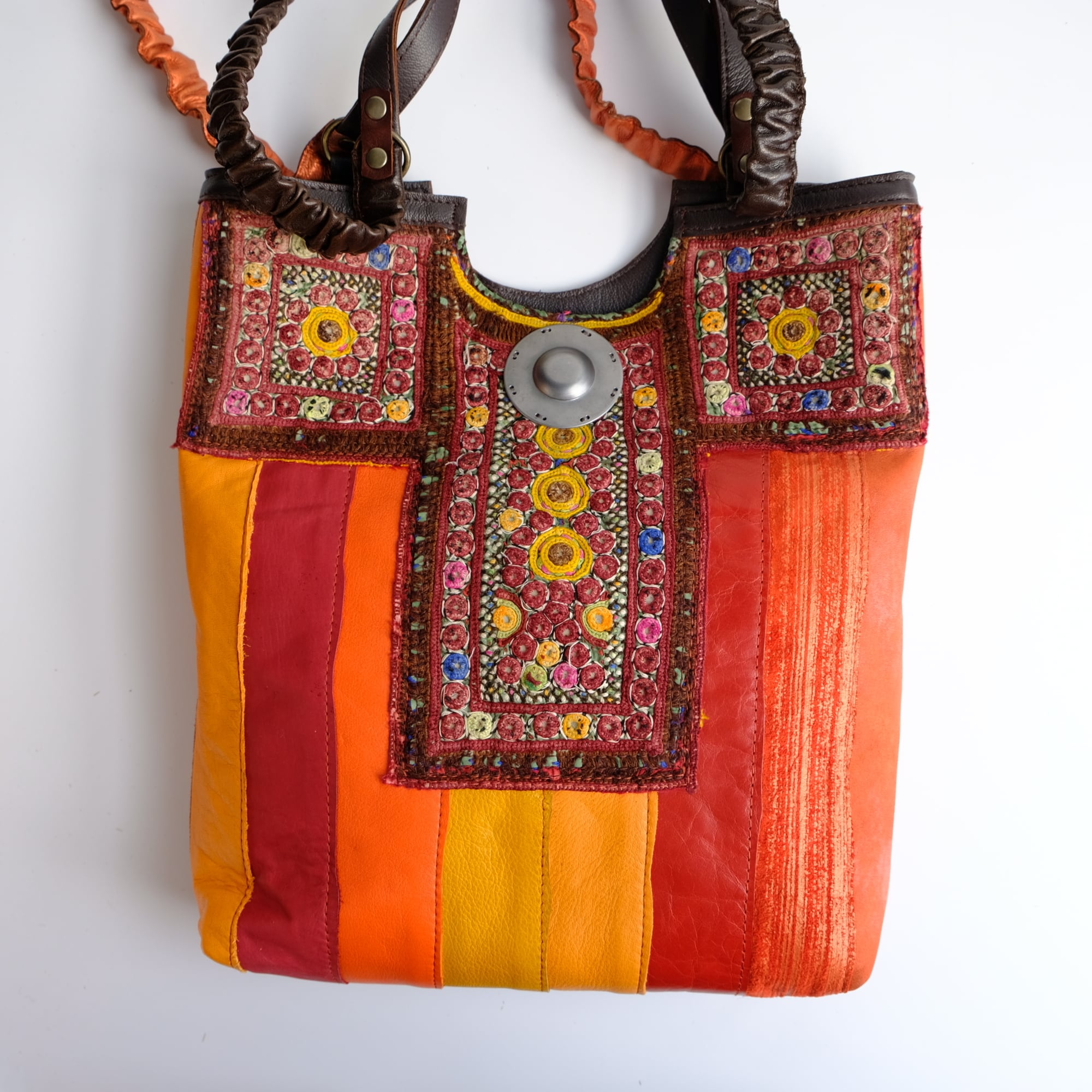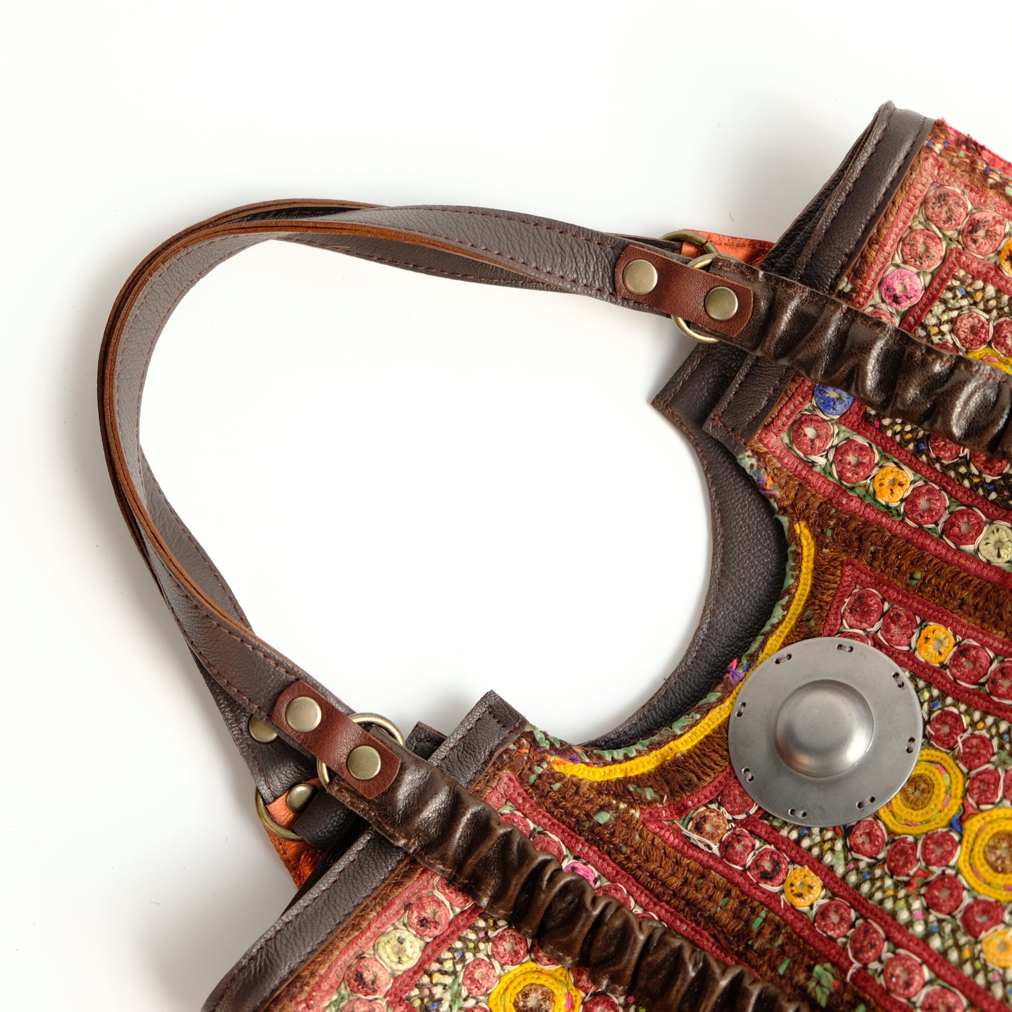 ビビッドカラーを基調にしたレザーパッチワーク、アフガニスタンの刺繍古布、タイのエクステリア用装飾金具がポイントです。