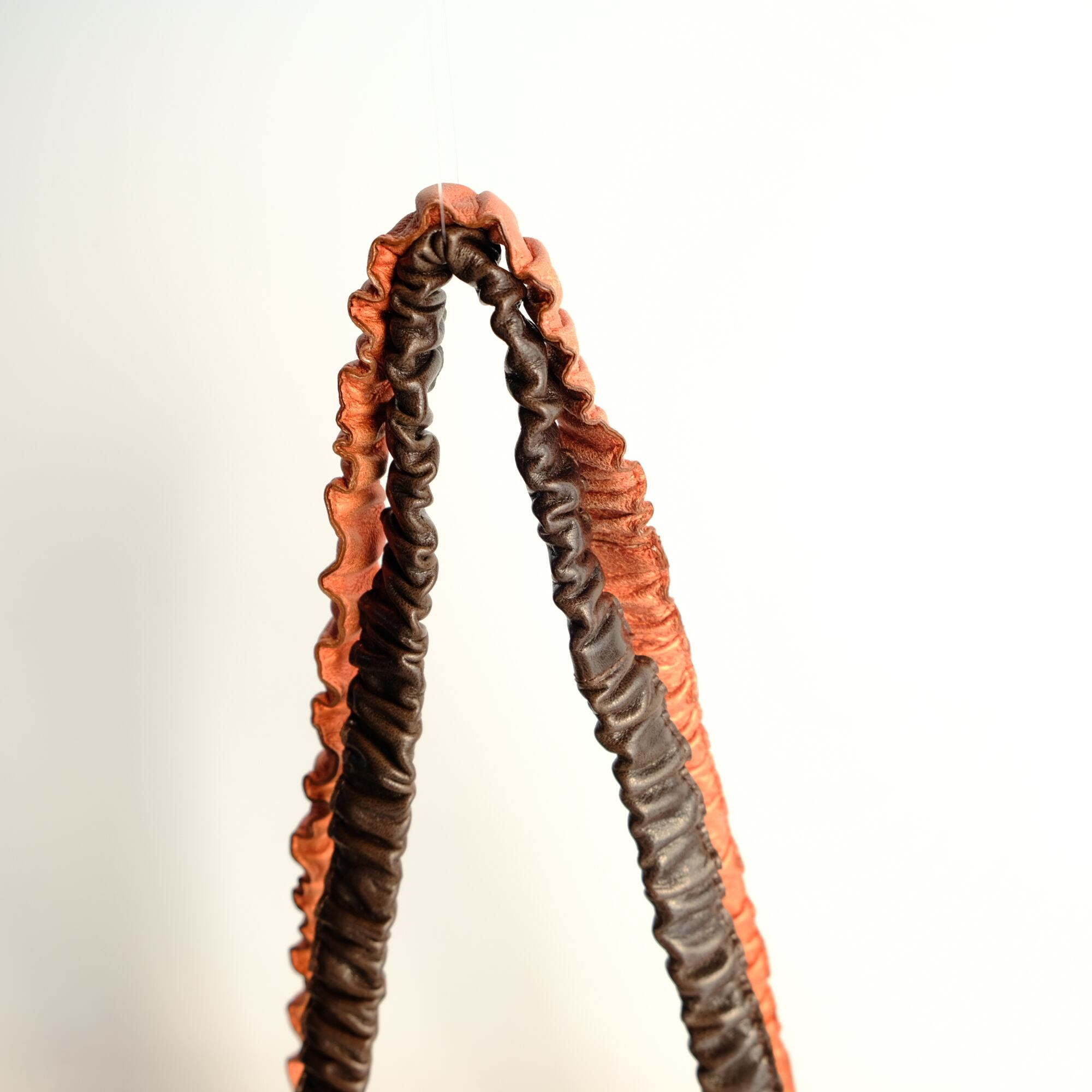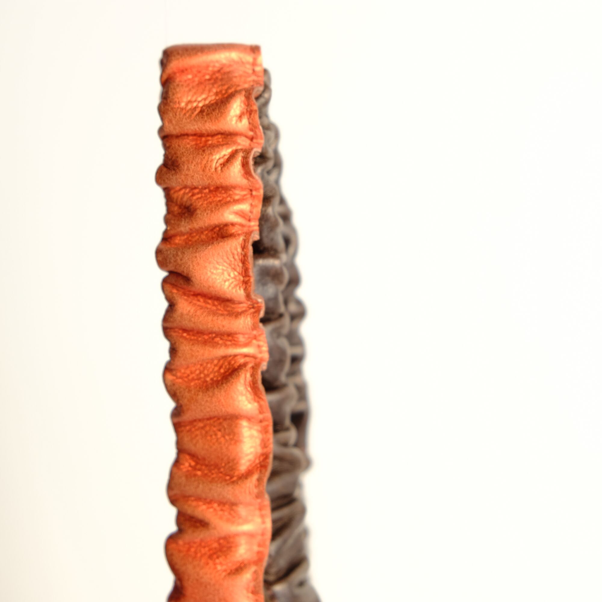 肩掛け紐は光沢のあるサーモンピンクのやわらかなレザーが洒落と個性を添えています。