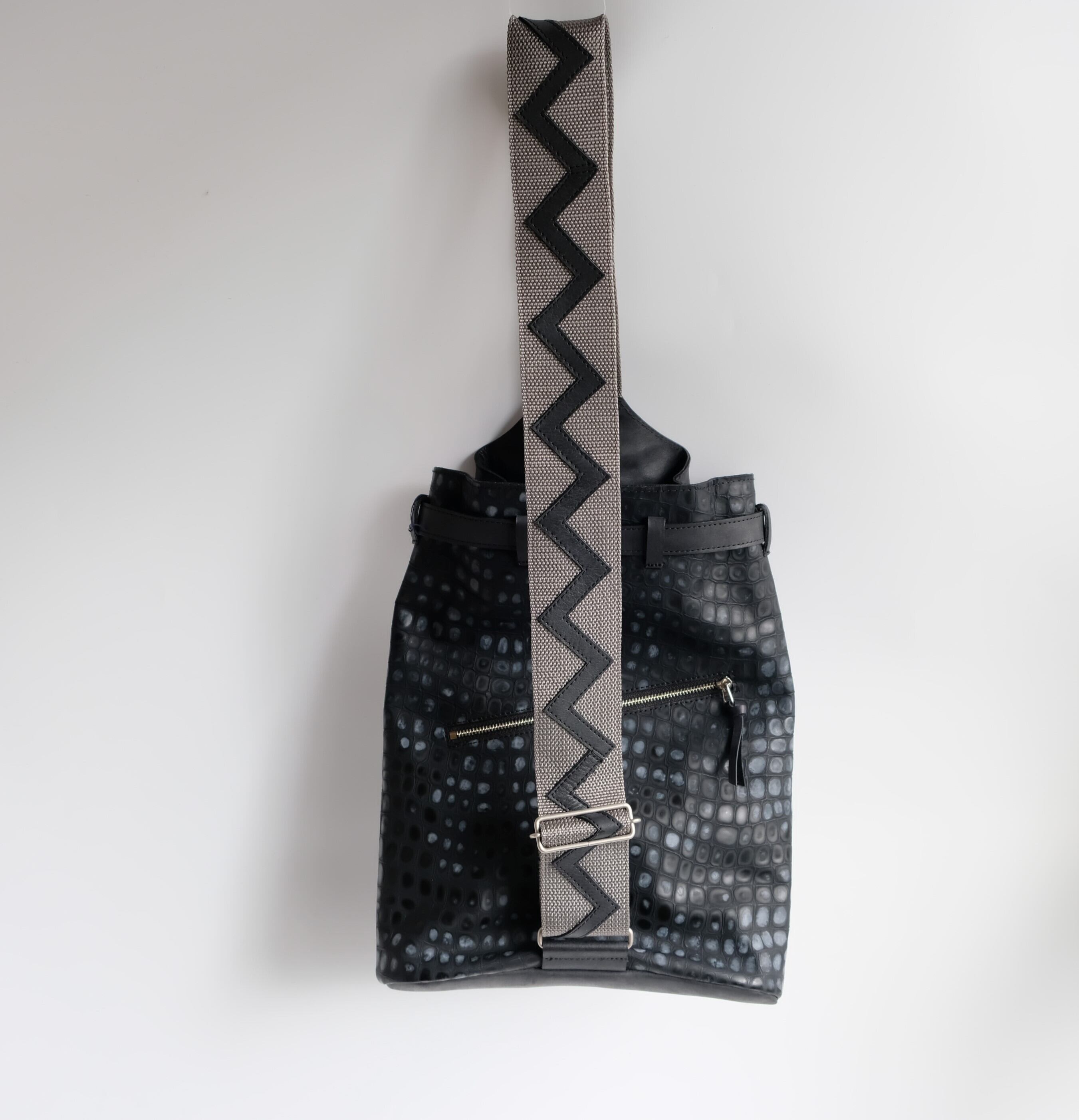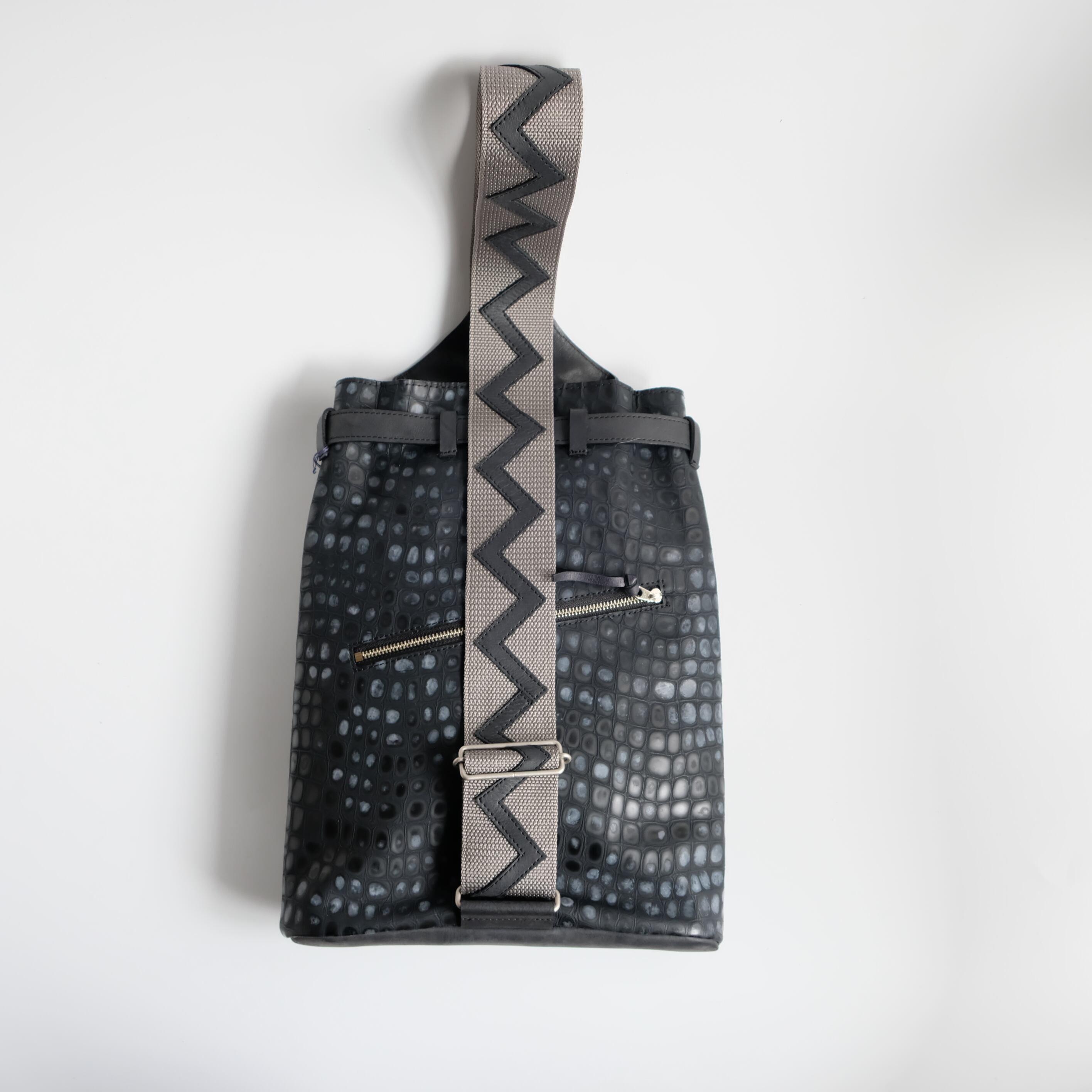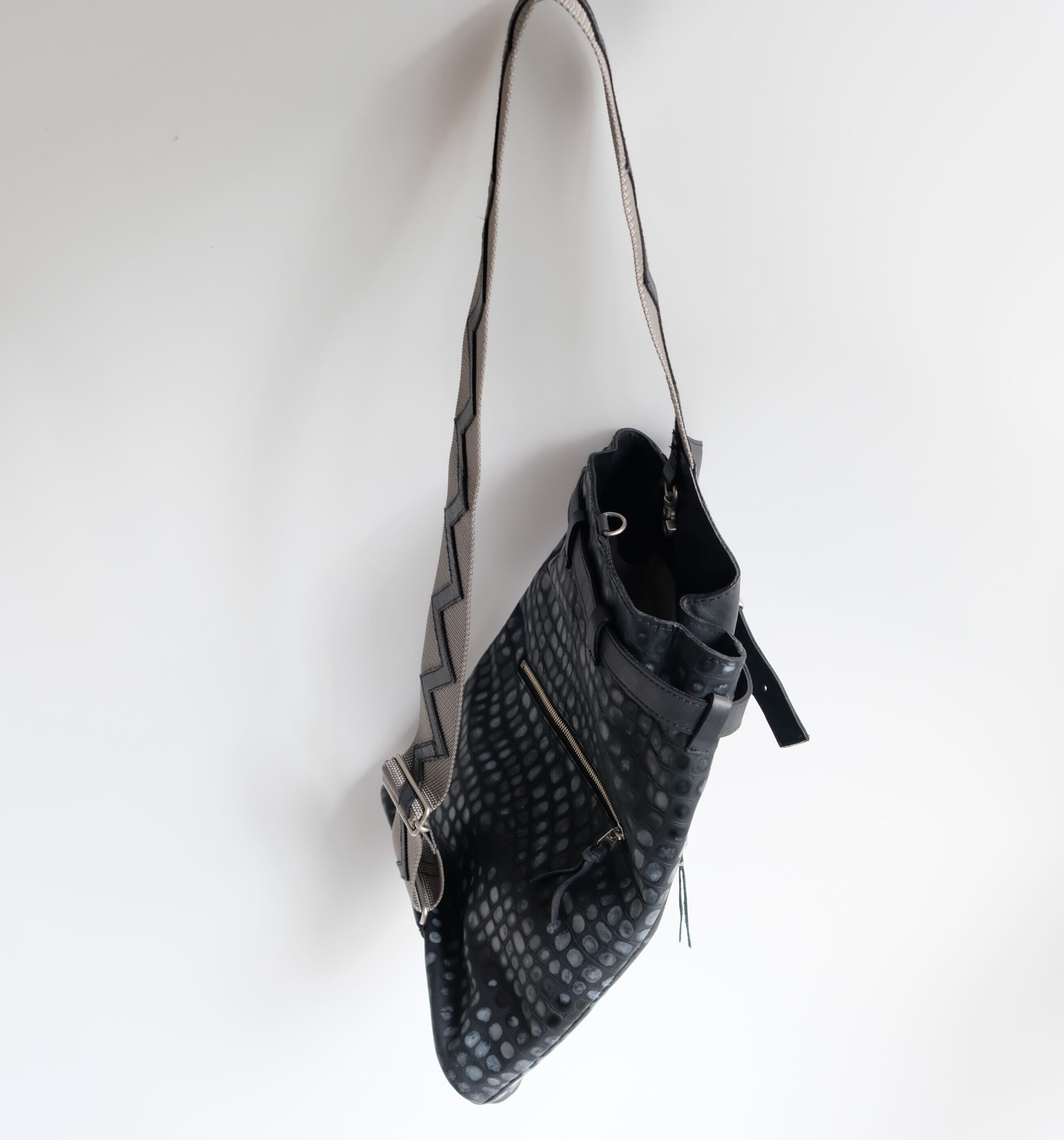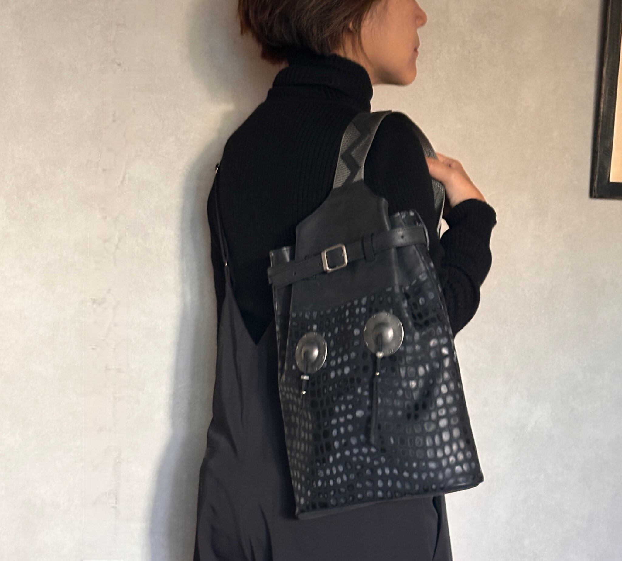 ブラックレザーと型押し模様ベースの袋型ショルダーバッグです。飾りベルトと鉄製金具がポイントです。軽量で肩に掛けやすく持ちやすいデザイン。