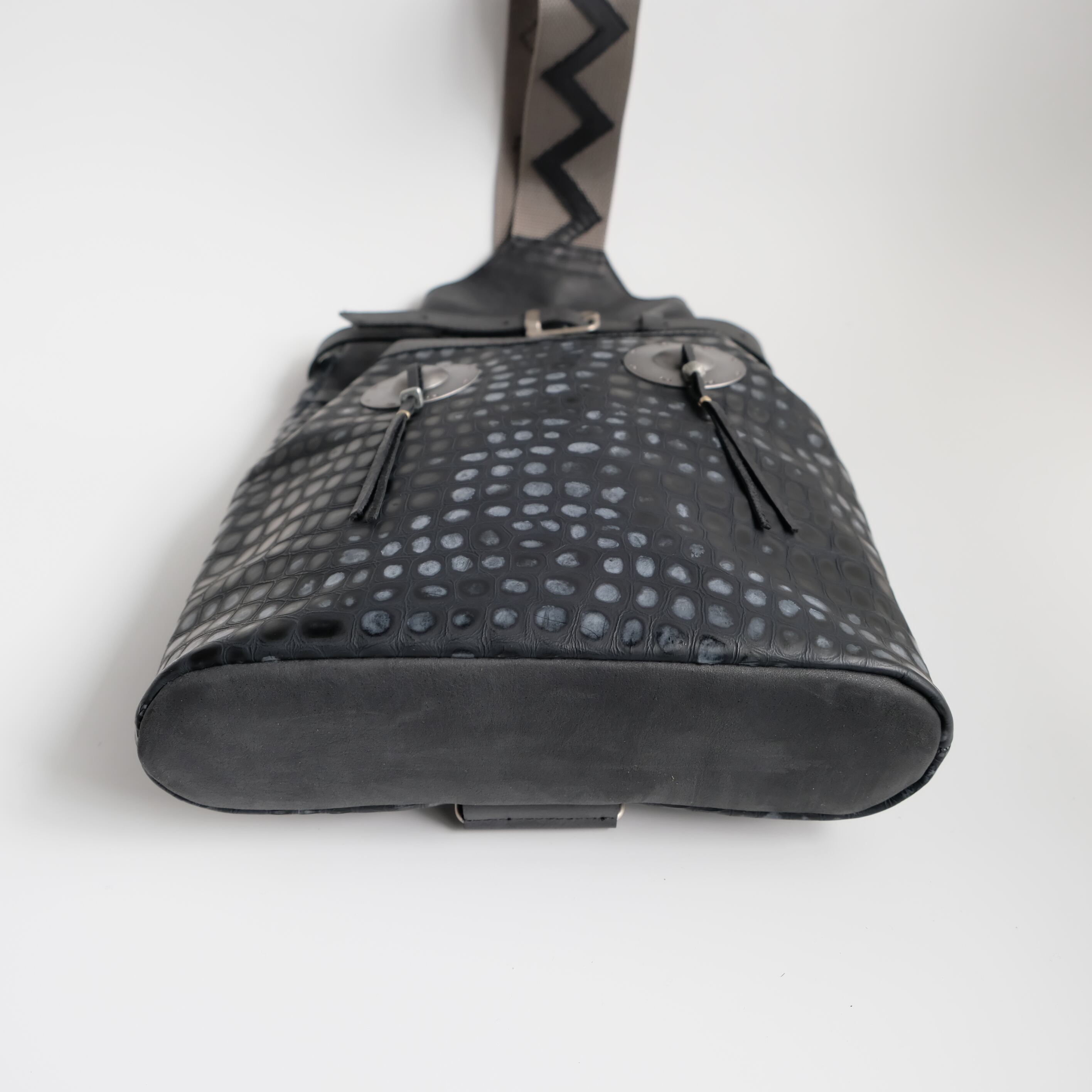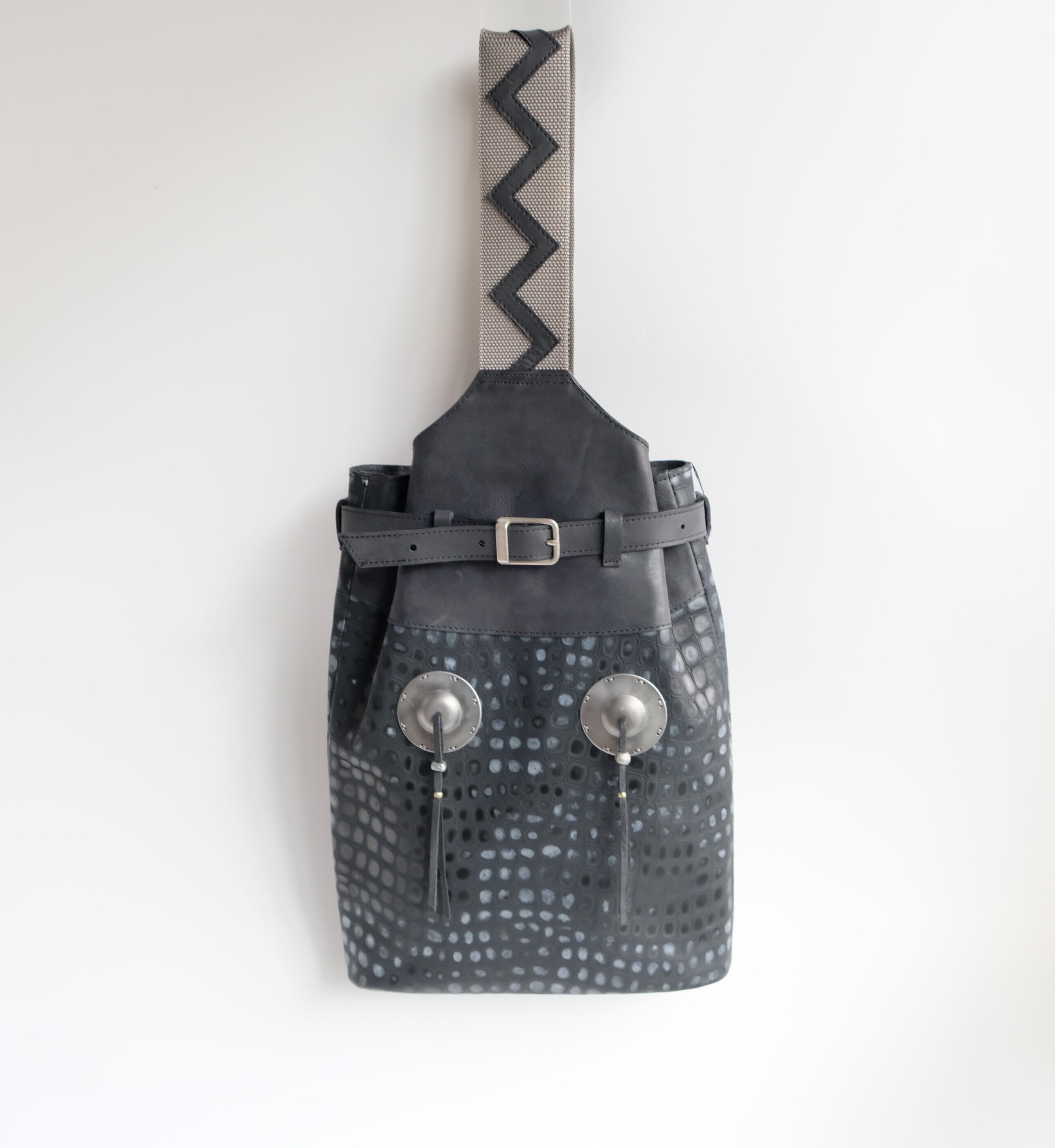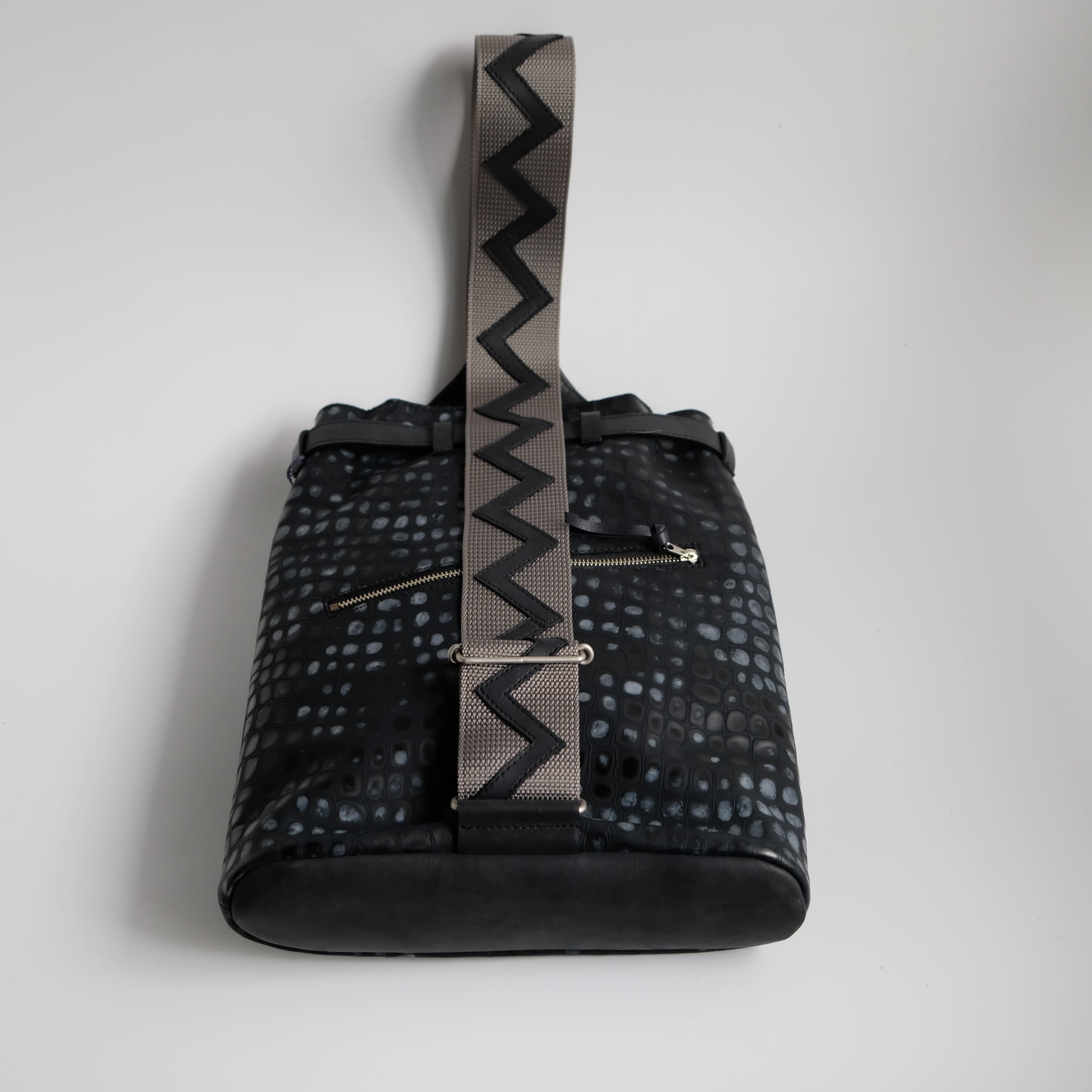 ブラックレザーと型押し模様ベースの袋型ショルダーバッグです。飾りベルトと鉄製金具がポイントです。軽量で肩に掛けやすく持ちやすいデザイン。