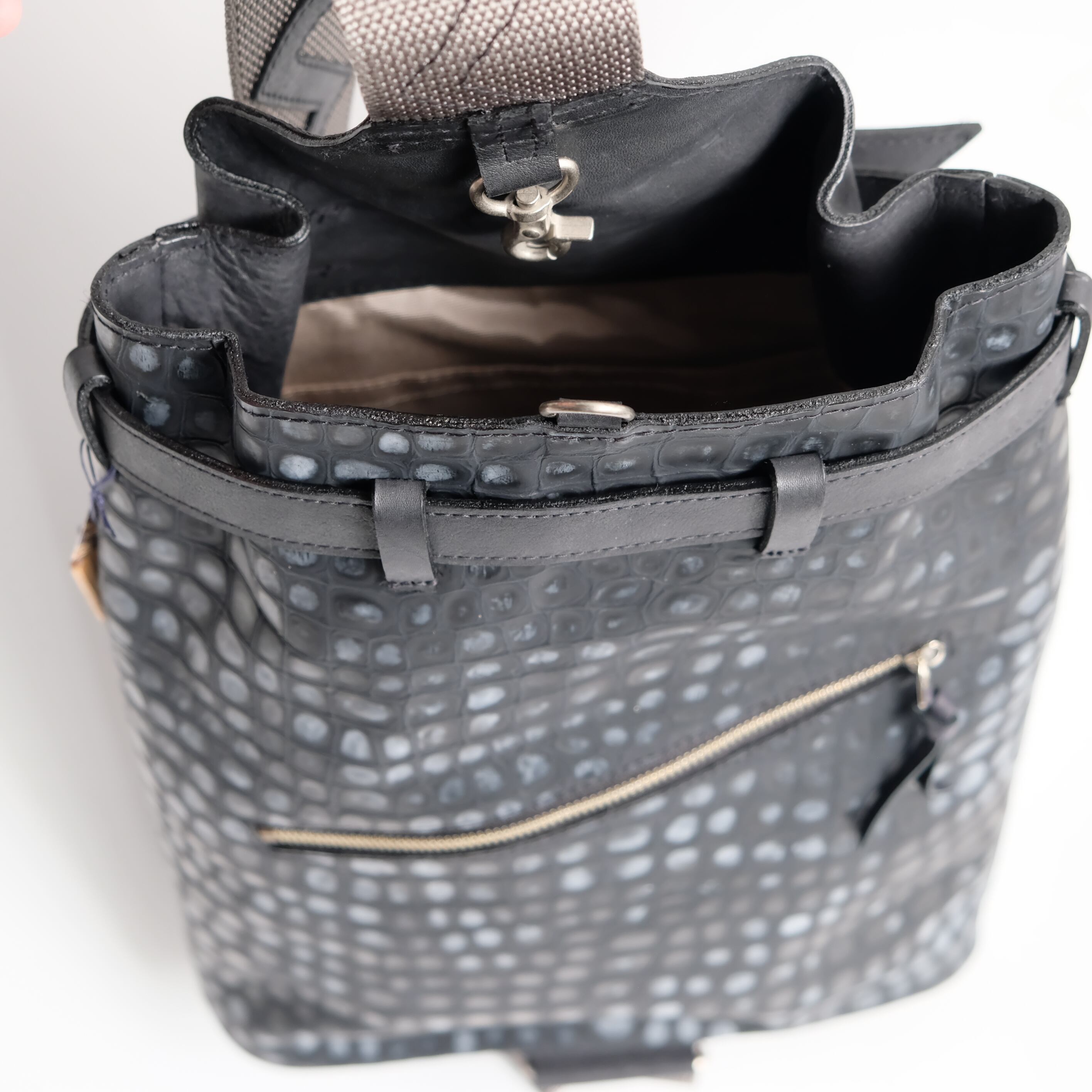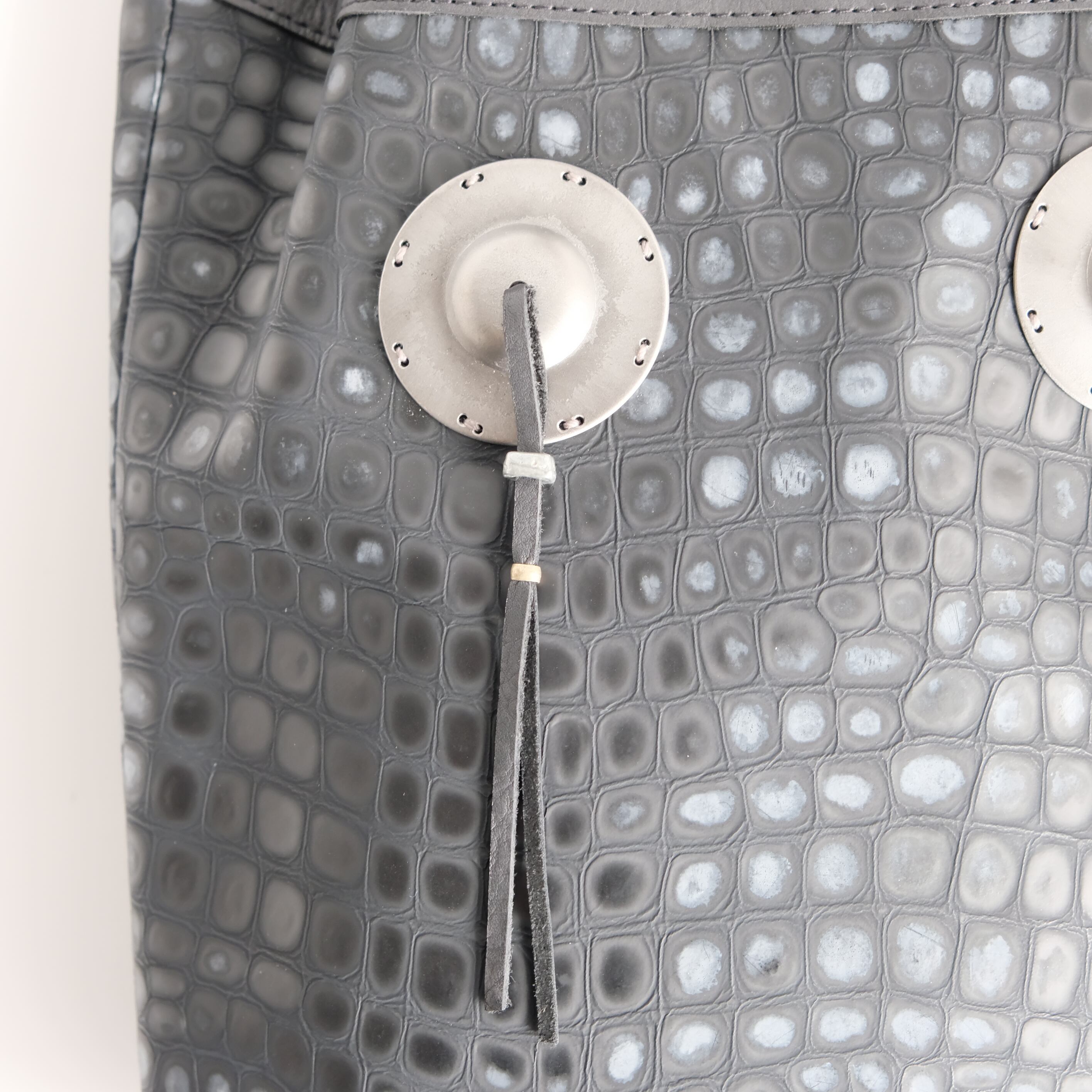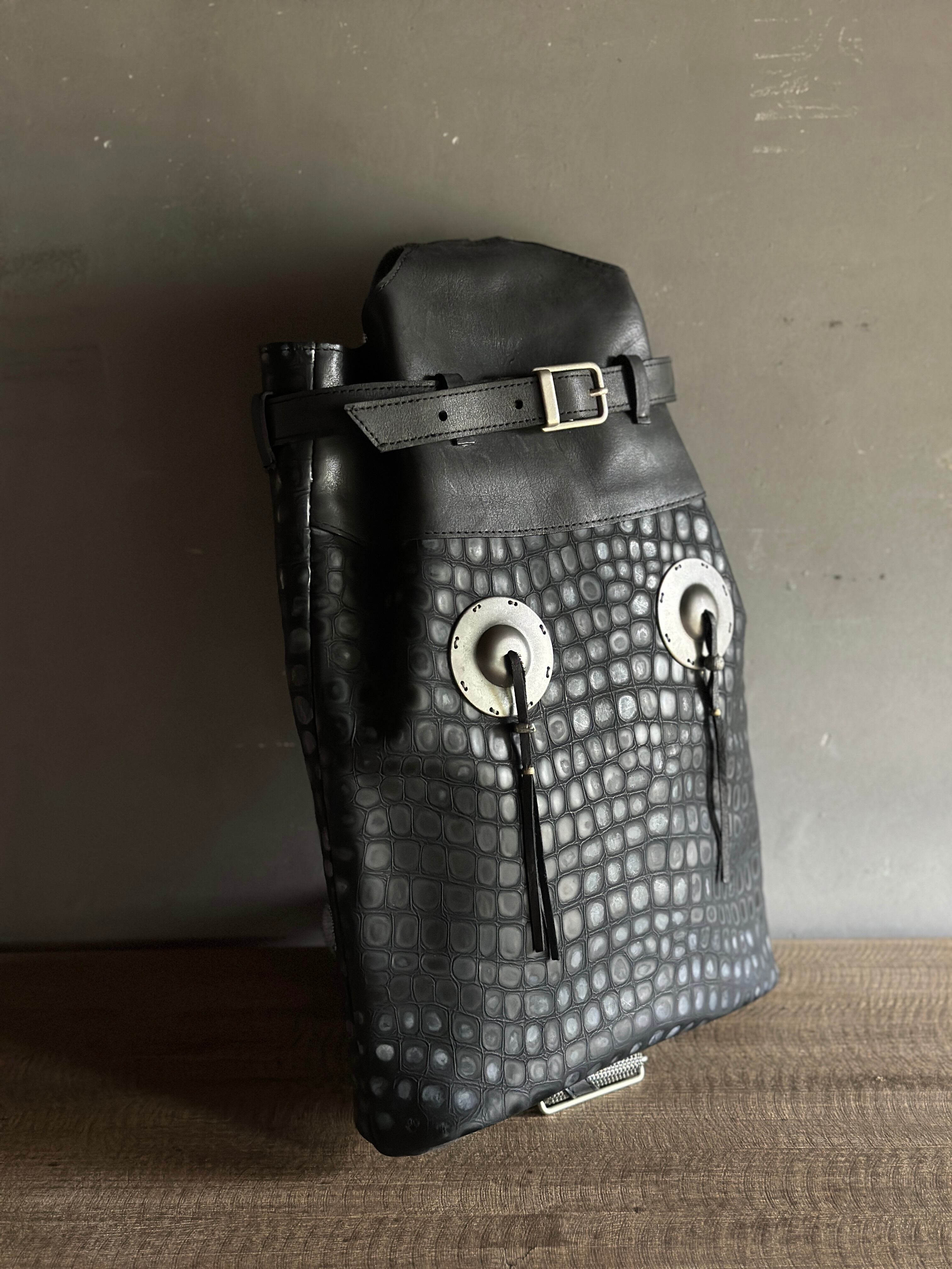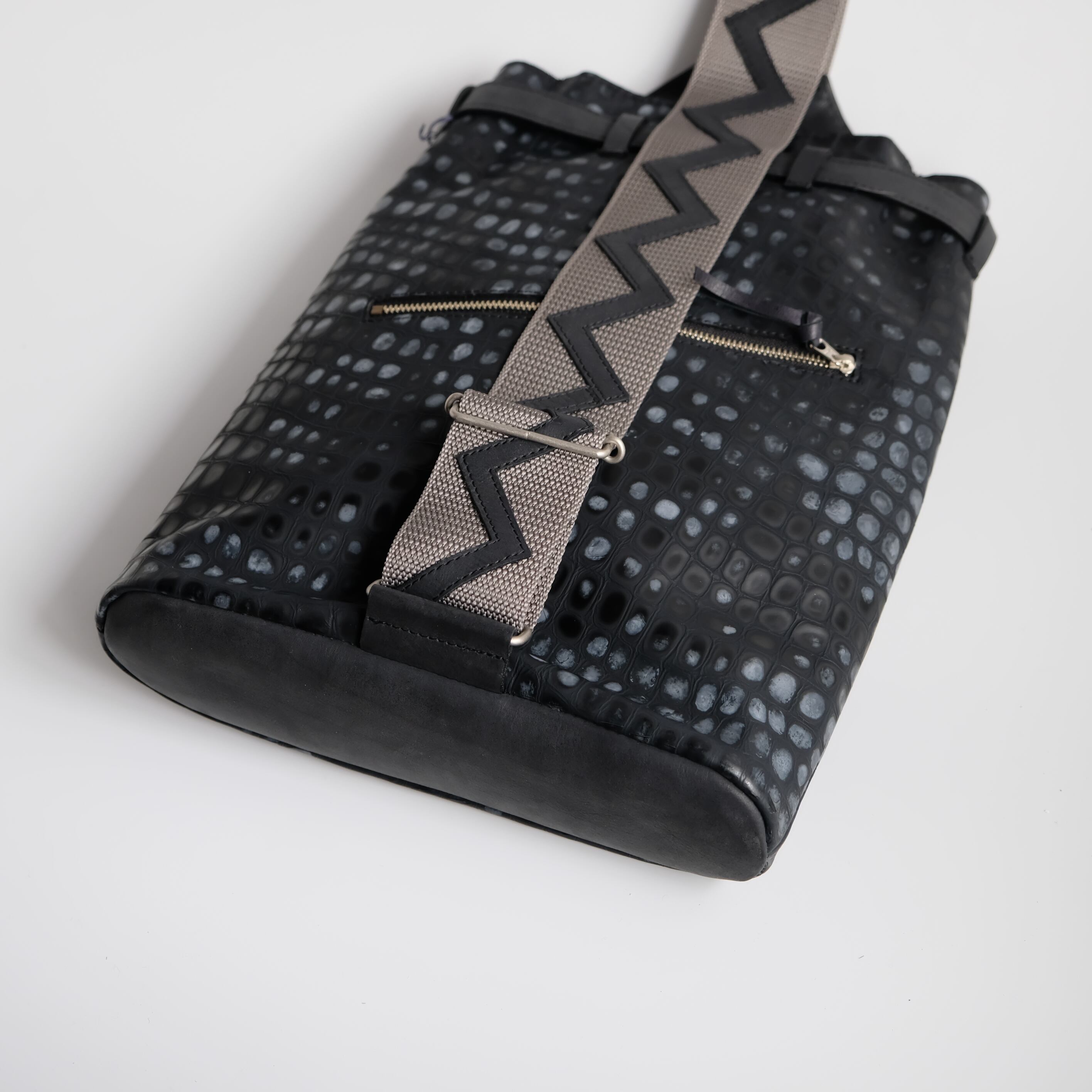 ブラックレザーと型押し模様ベースの袋型ショルダーバッグです。飾りベルトと鉄製金具がポイントです。軽量で肩に掛けやすく持ちやすいデザイン。