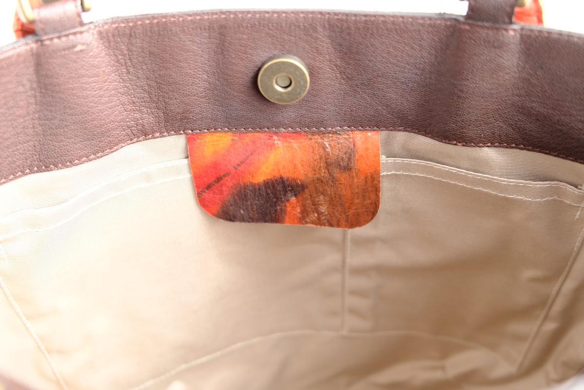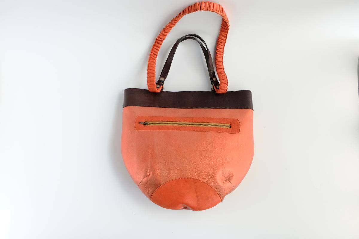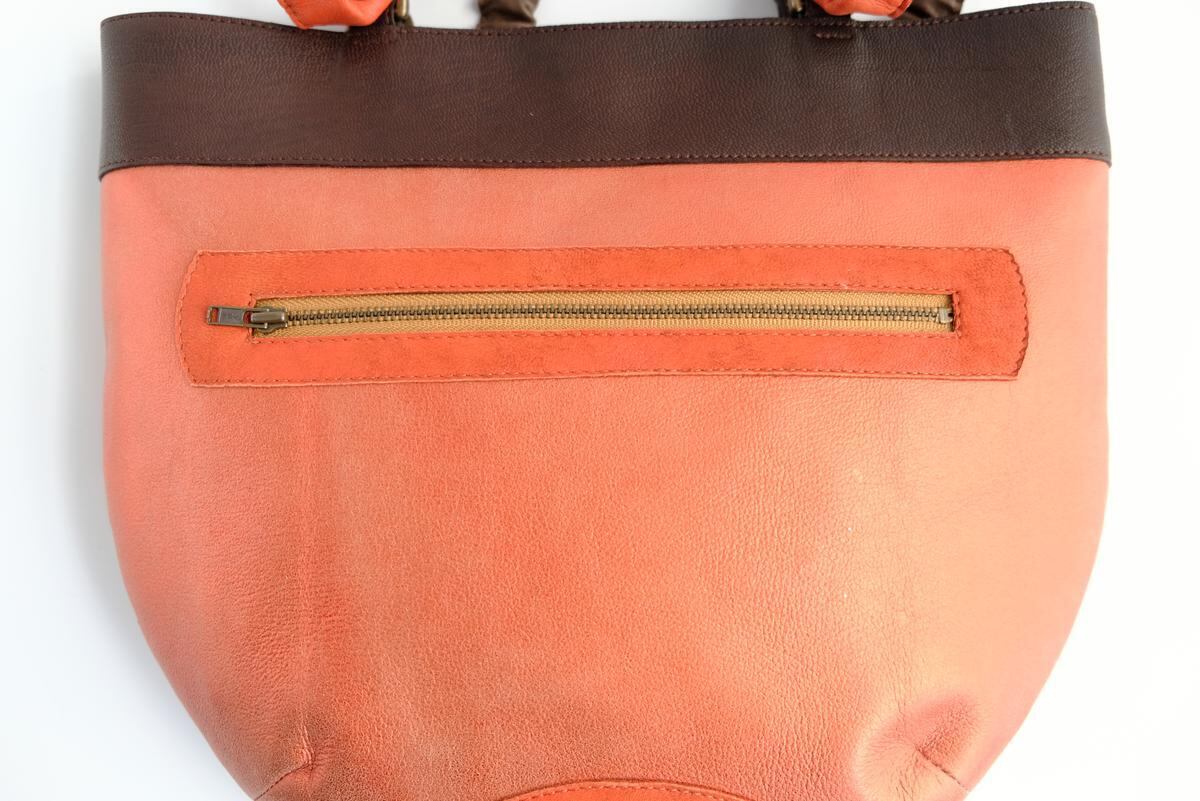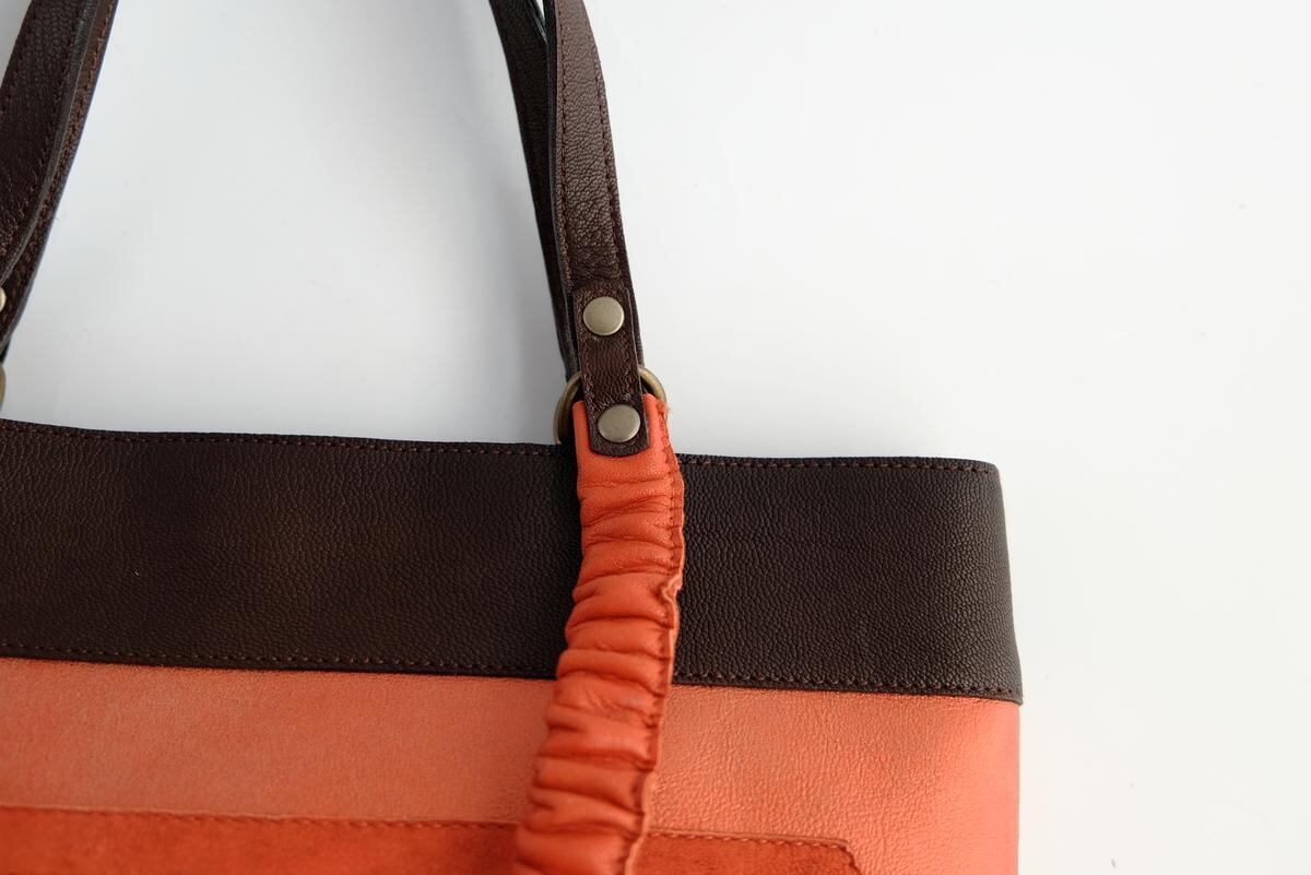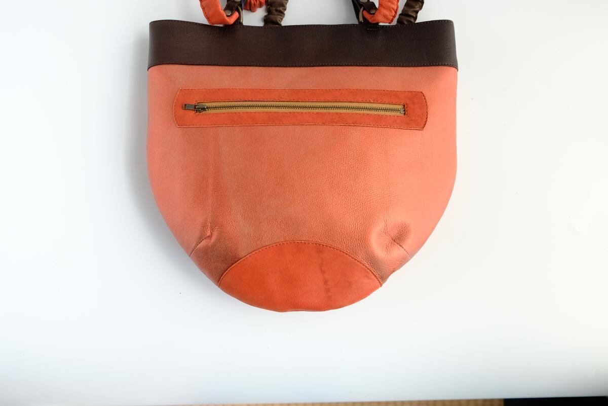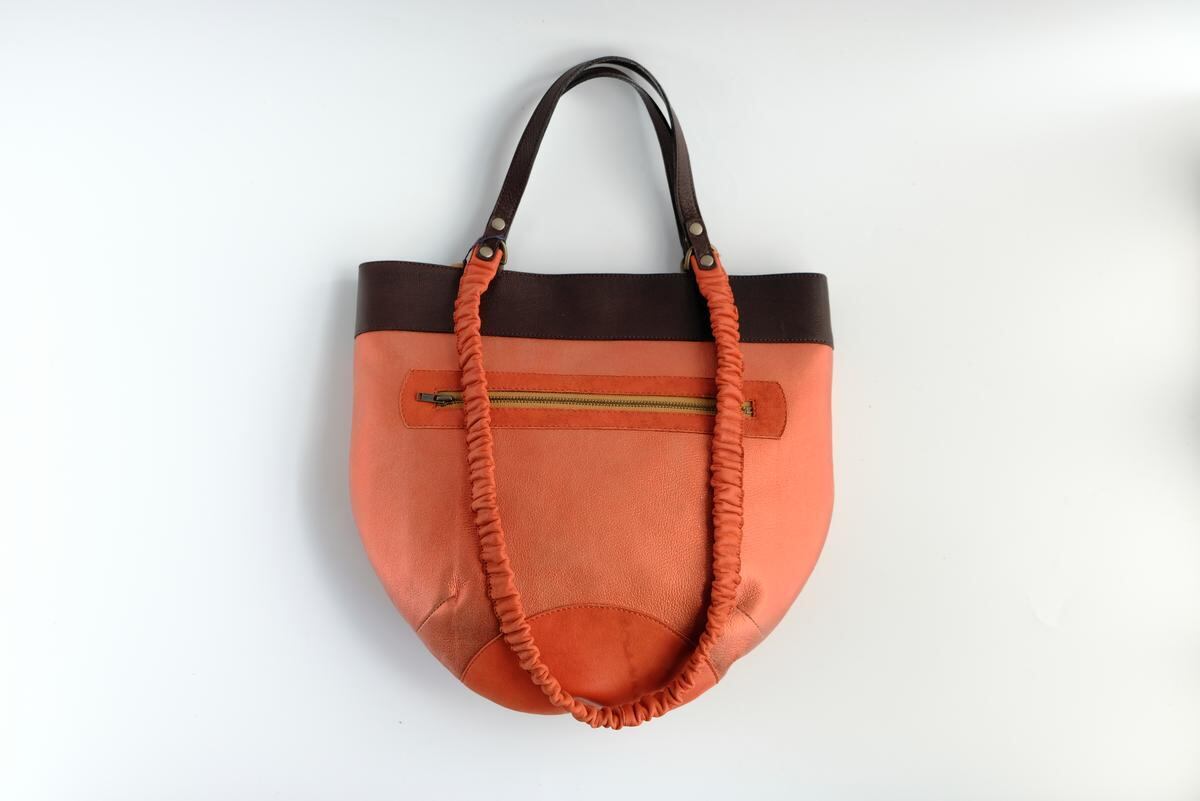 肩掛け紐はシュシュ状にしたオレンジと茶のやわらかなレザーが洒落と個性を添えています。
