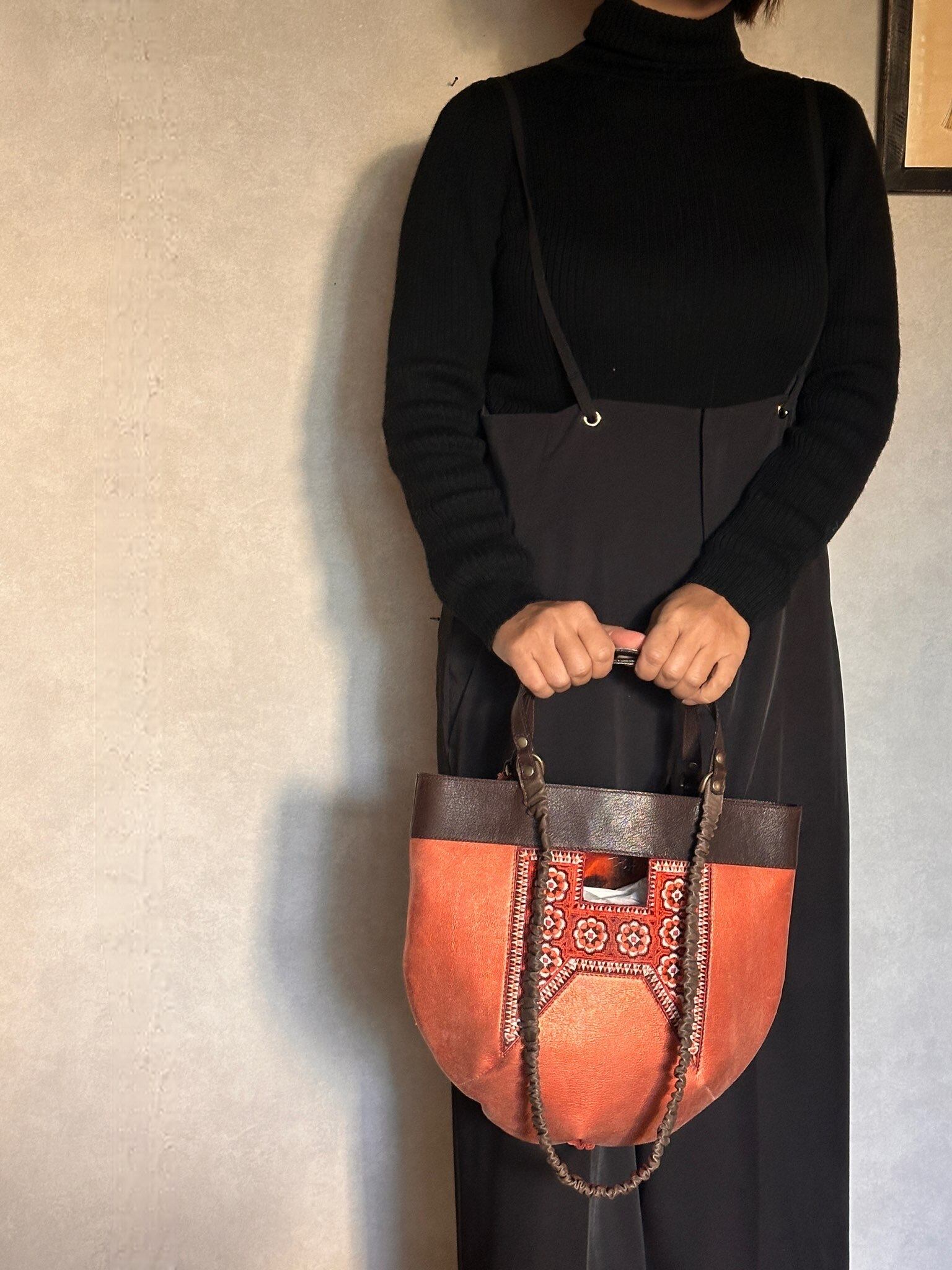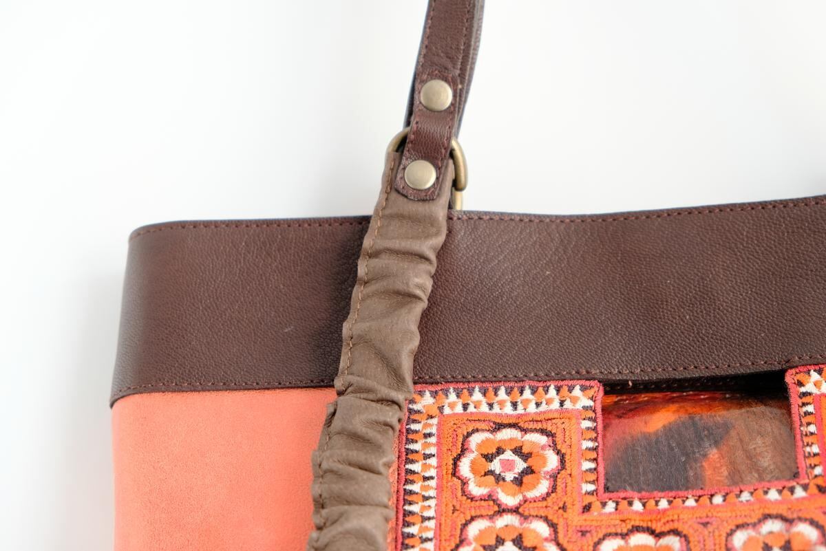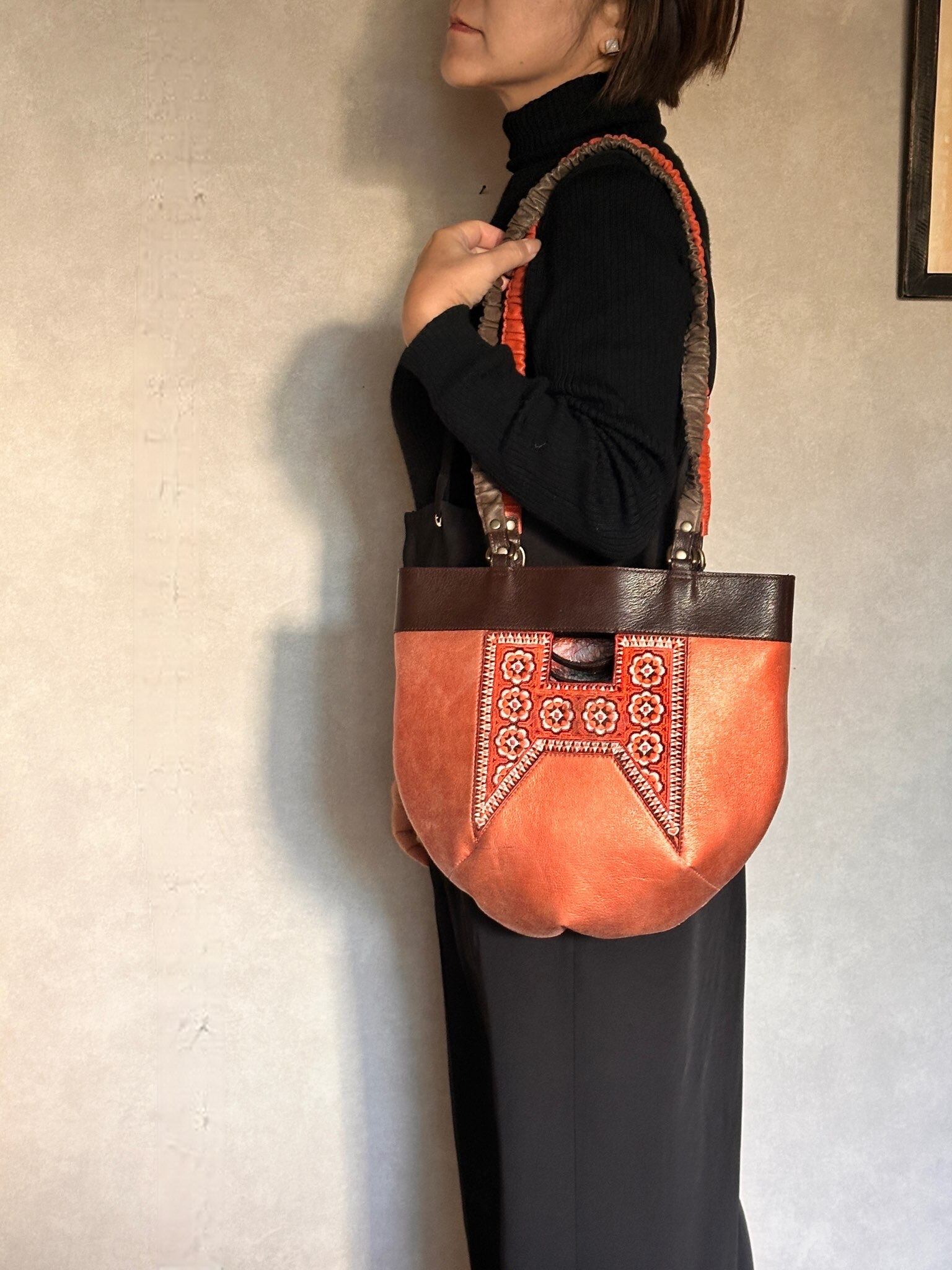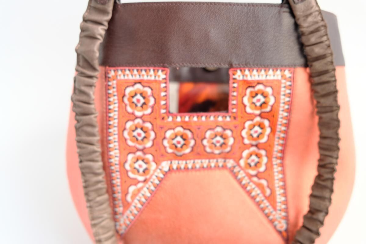 光沢のあるピンクオレンジ色の珍しいレザーをベースに、ミャオ族(タイ)の刺繍古布がポイントです。