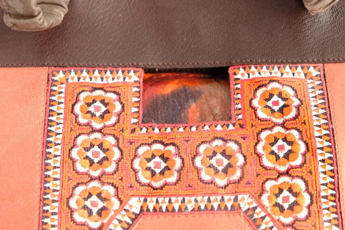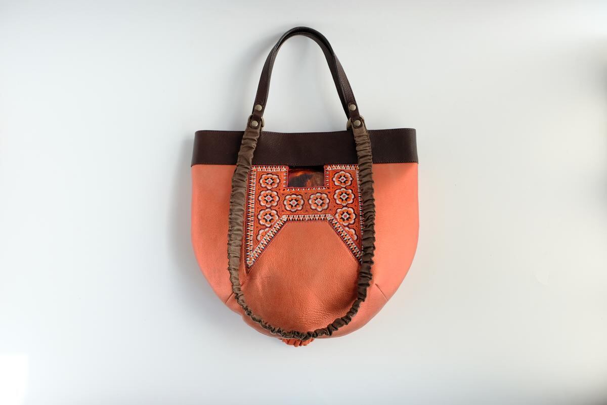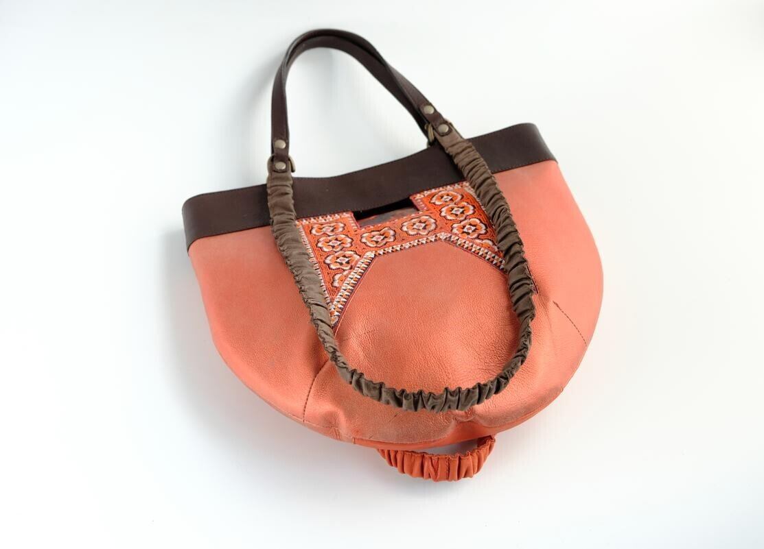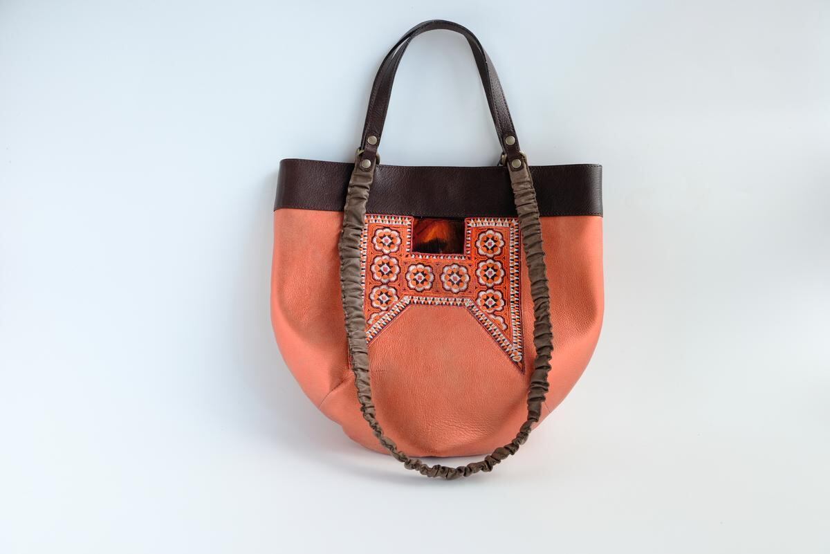 光沢のあるピンクオレンジ色の珍しいレザーをベースに、ミャオ族(タイ)の刺繍古布がポイントです。