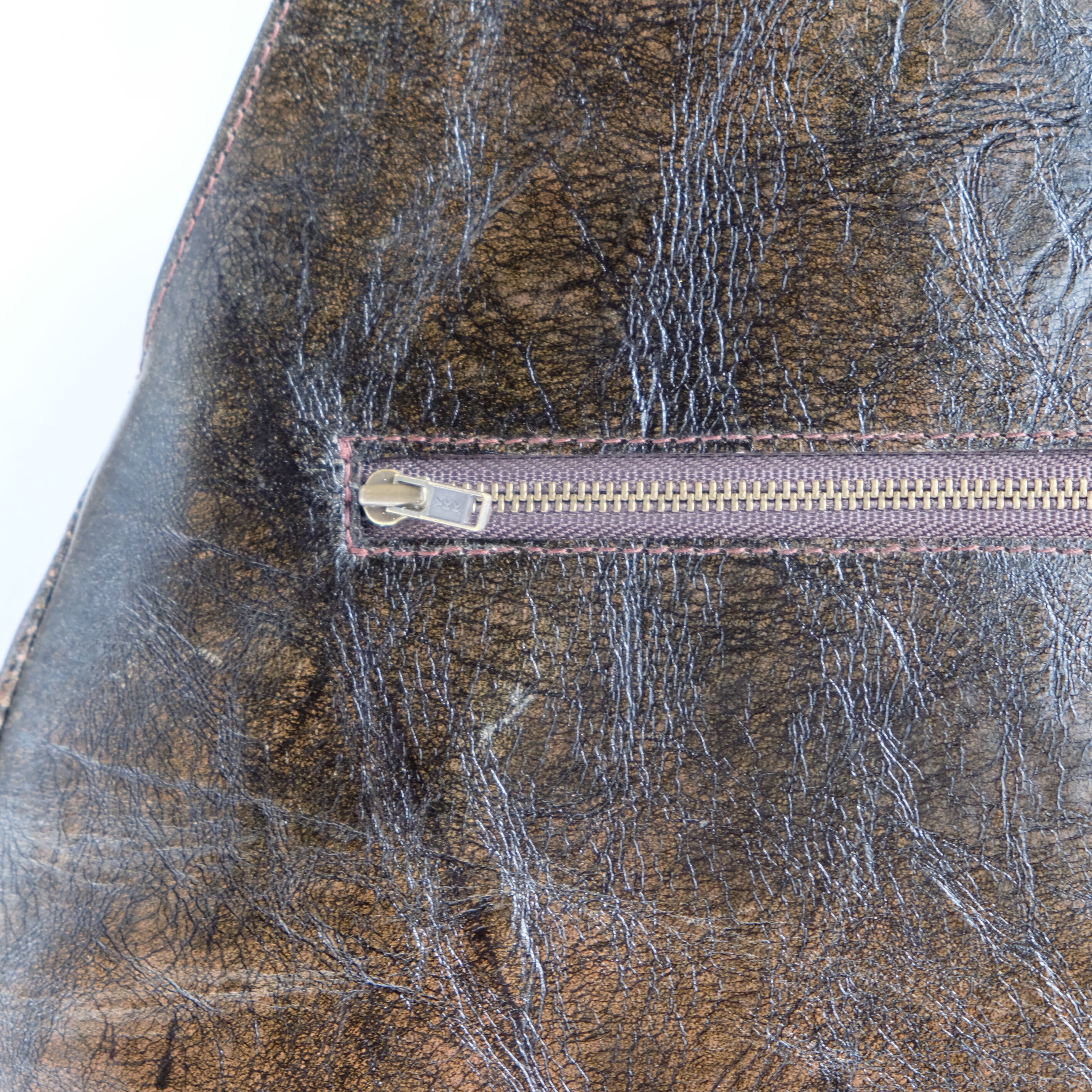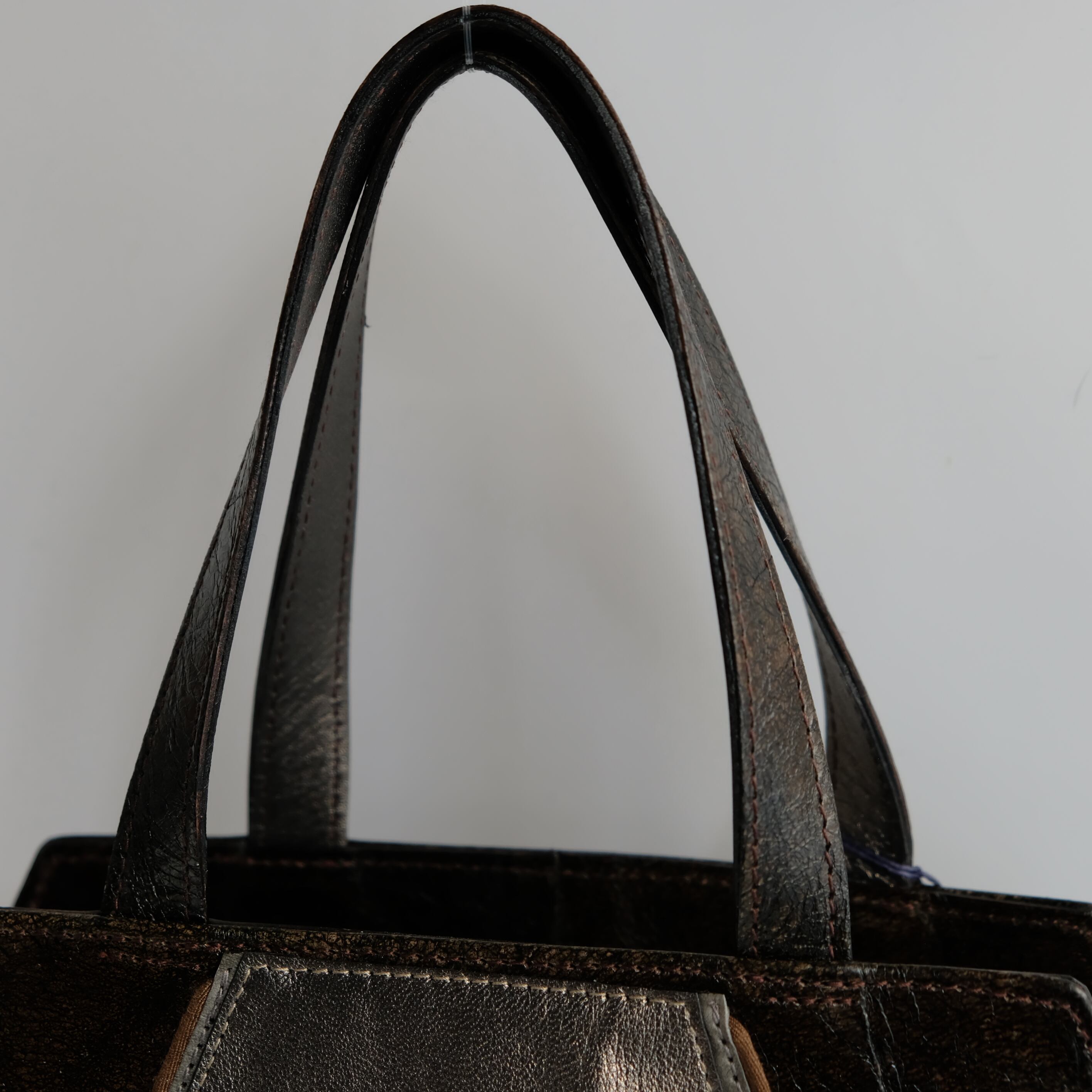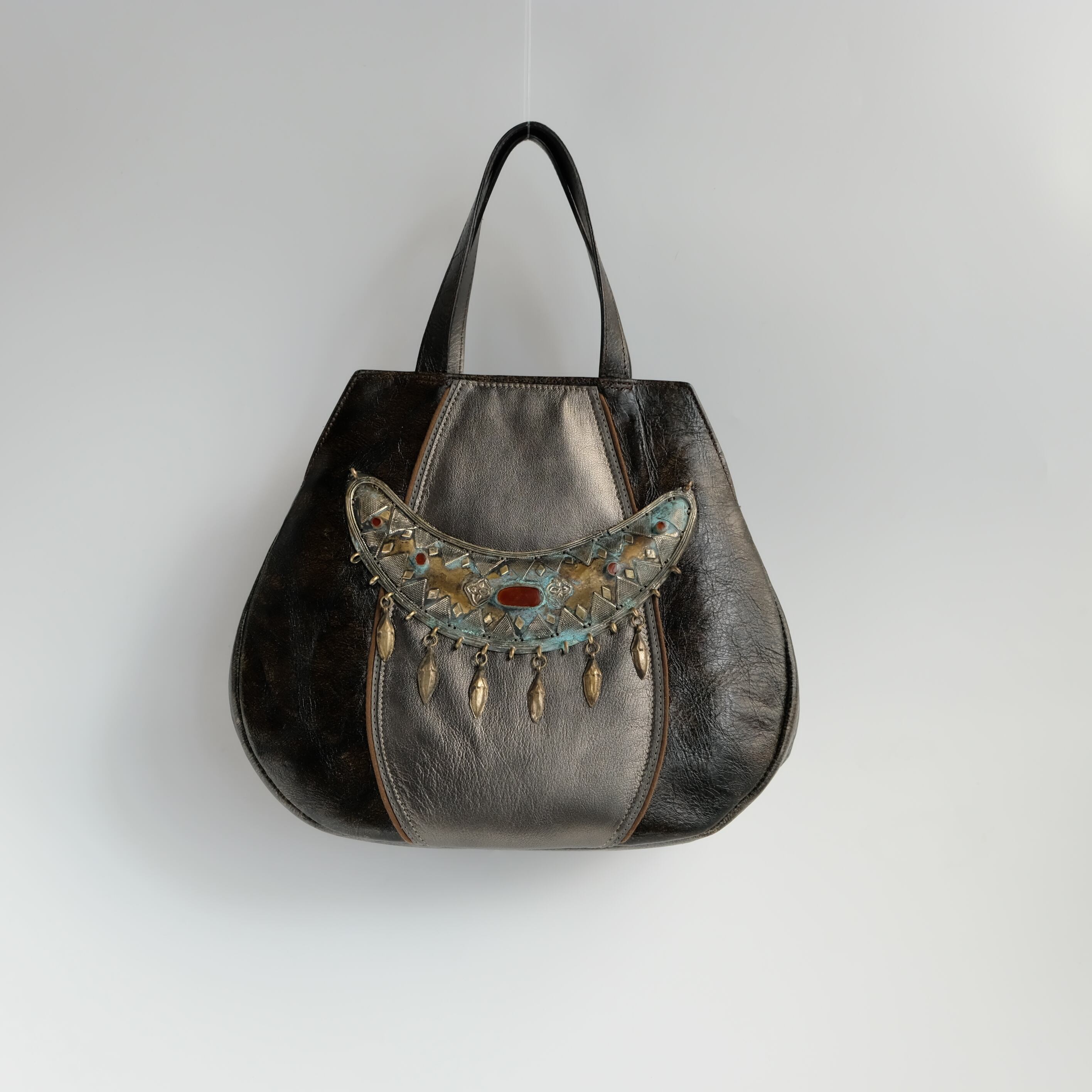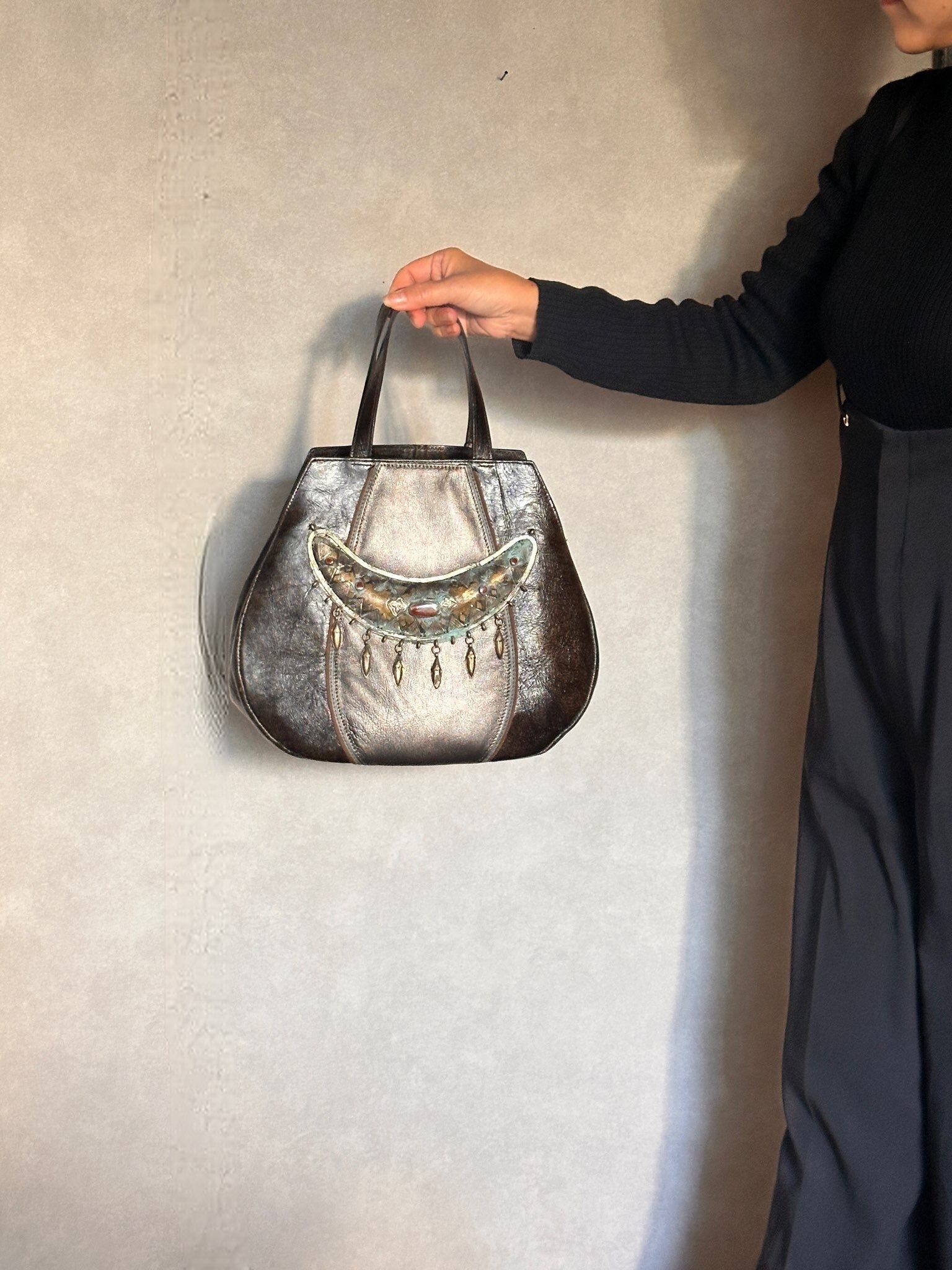 ブラウンベースのレザー、金具装飾をポイントにしたバッグです。