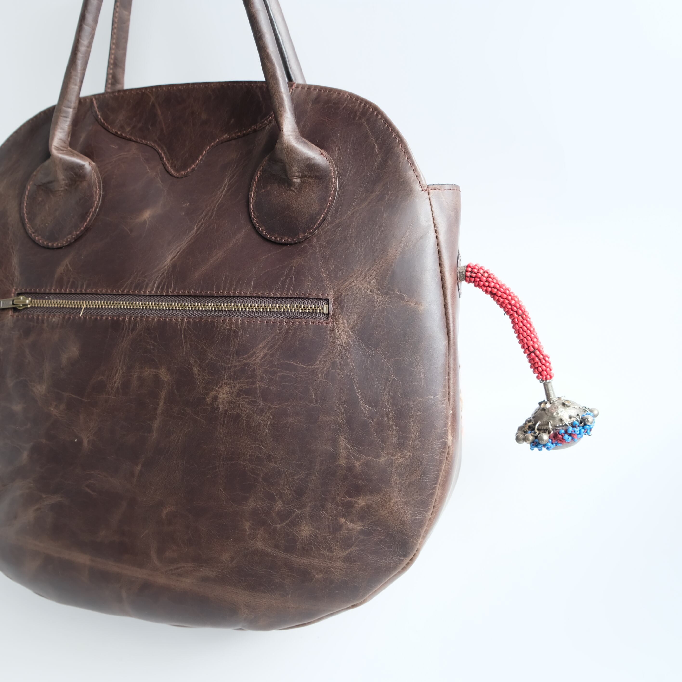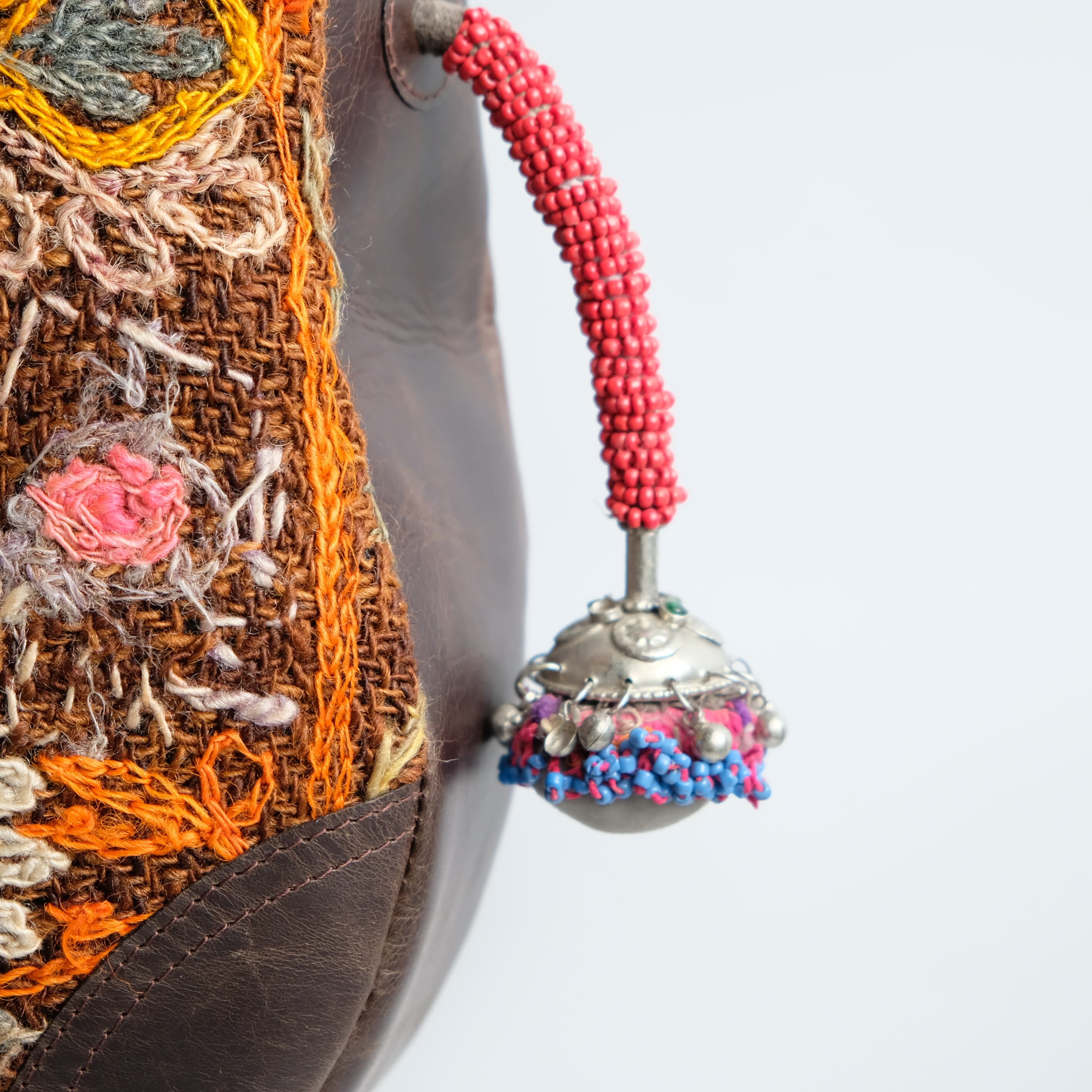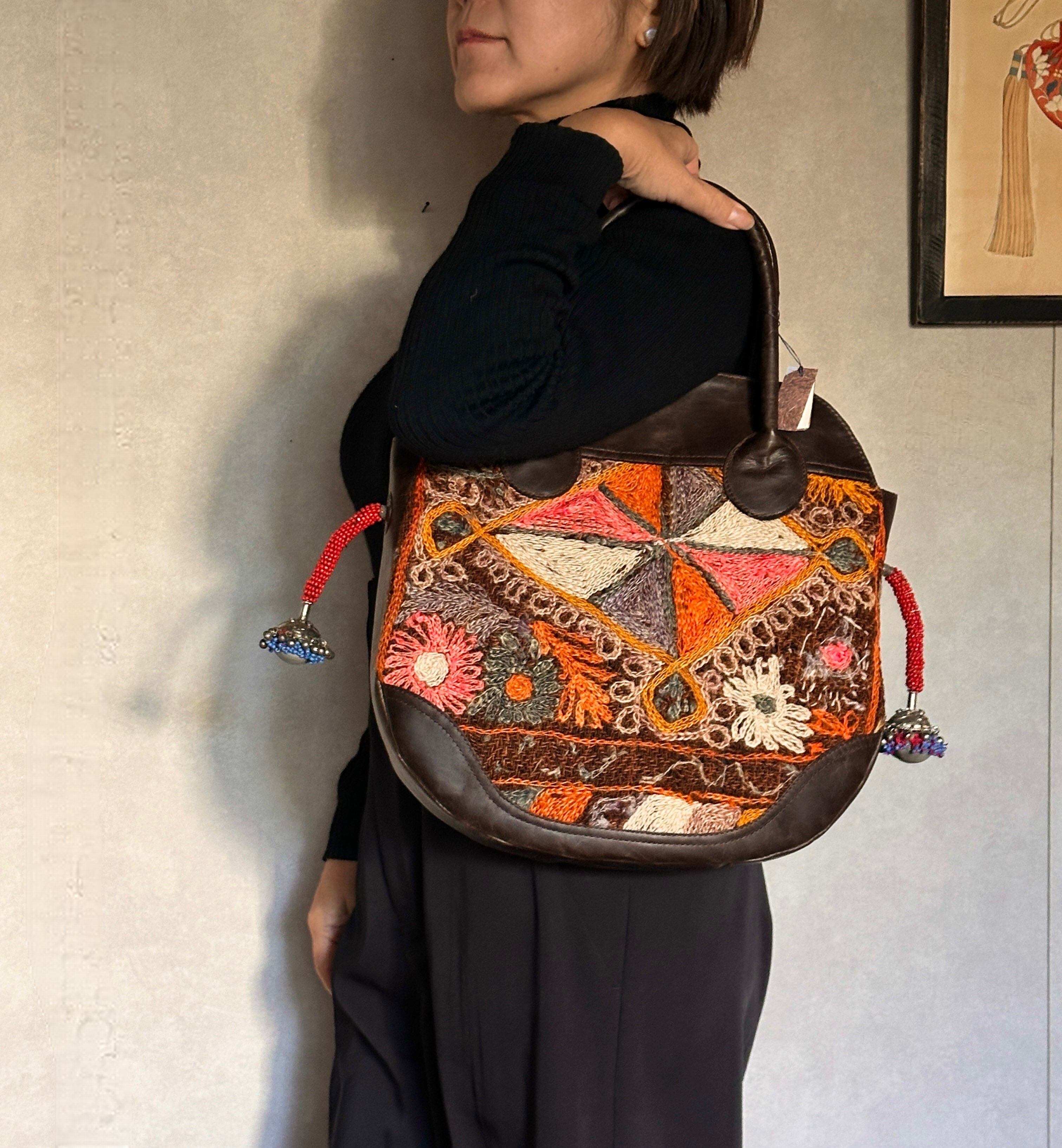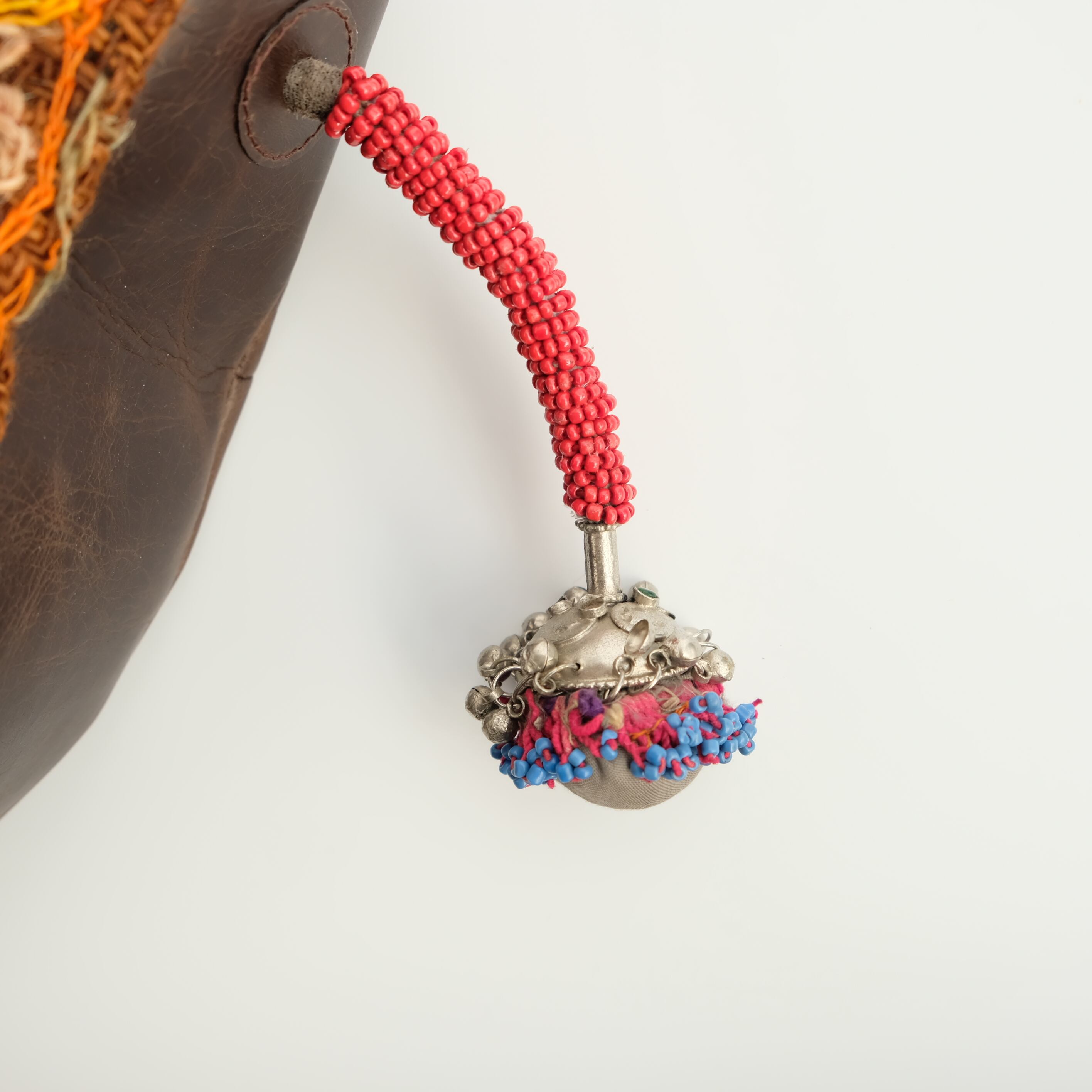 ブラウンベースのレザーに、贅沢にあしらったオールドキリムが目を惹きます。両サイドのビーズチャームがユニークなポイント