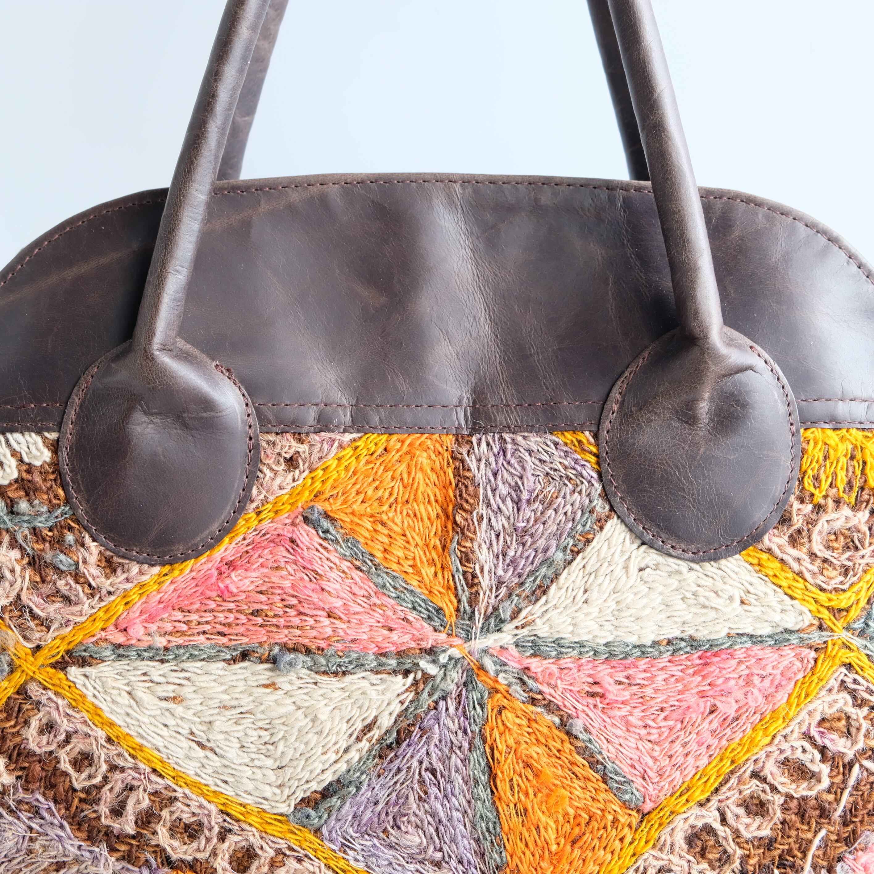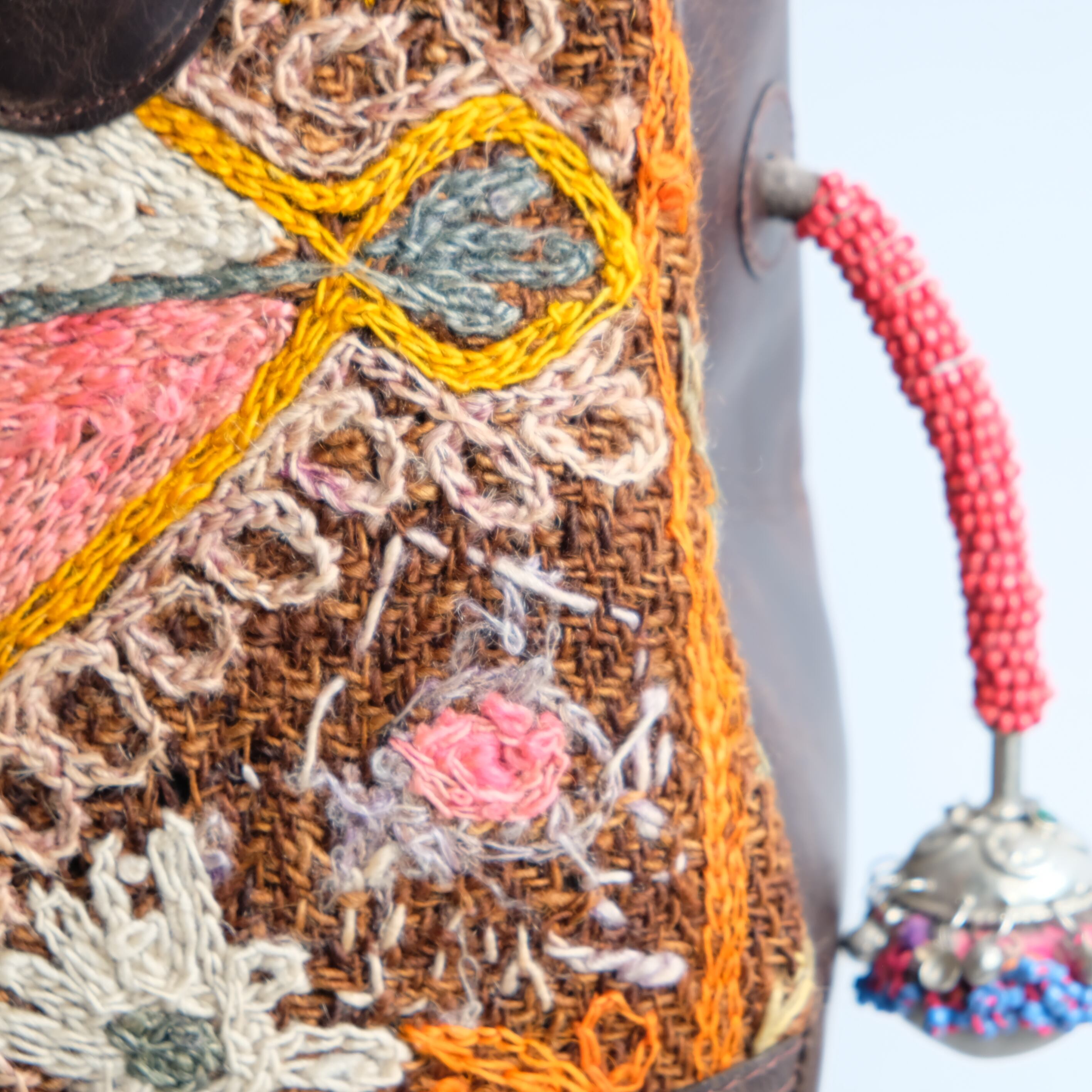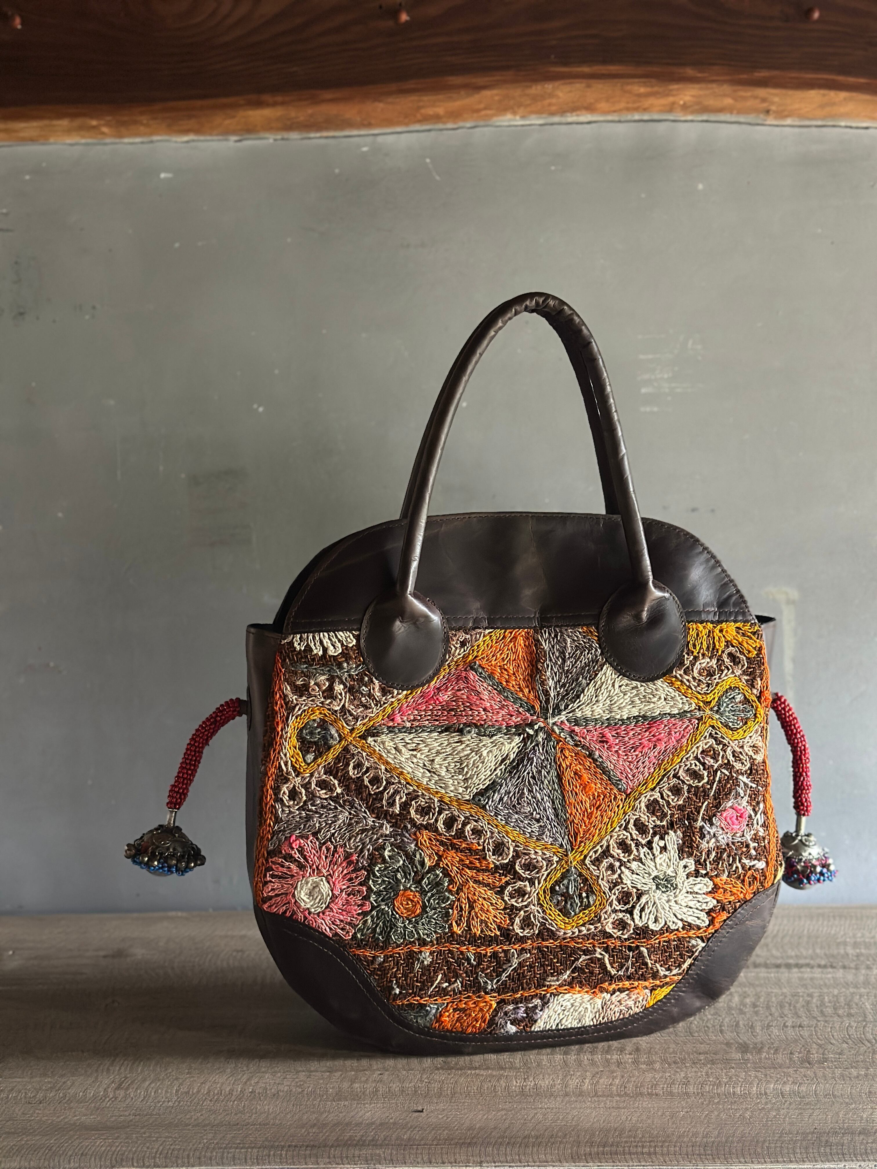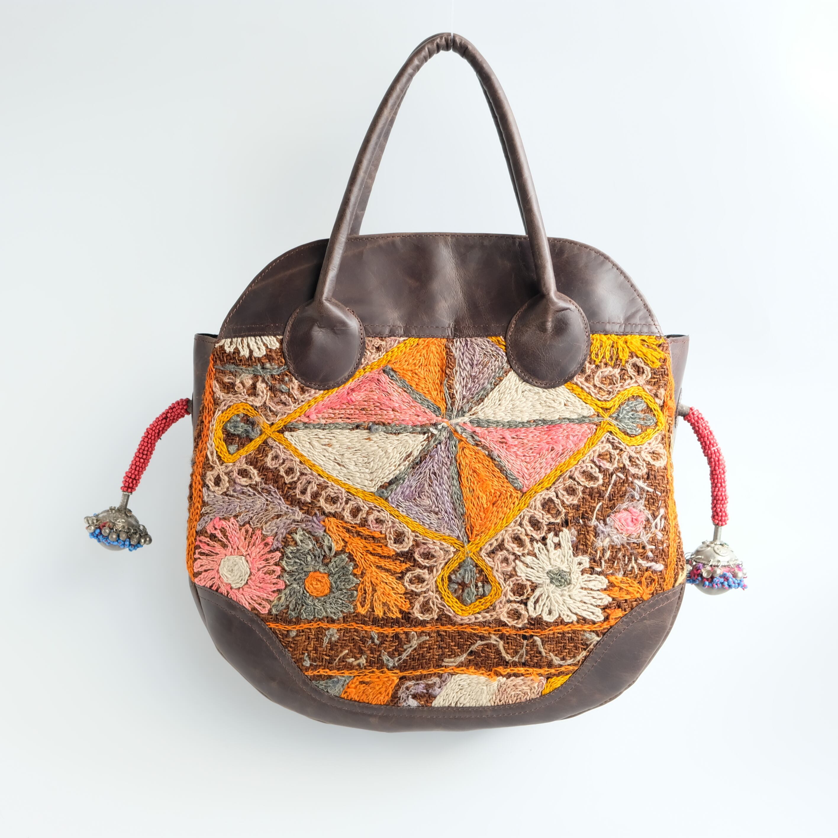 ブラウンベースのレザーに、贅沢にあしらったオールドキリムが目を惹きます。両サイドのビーズチャームがユニークなポイント