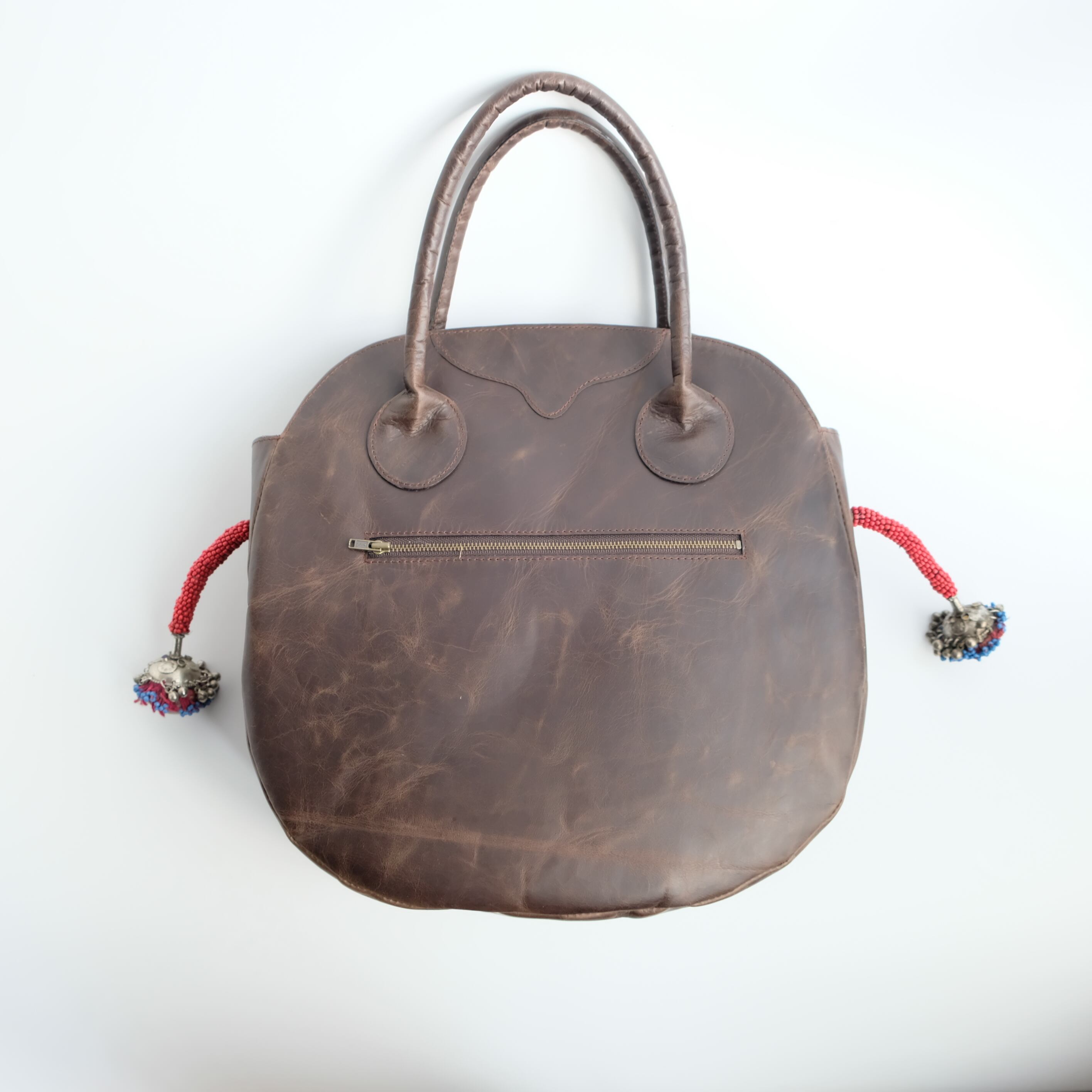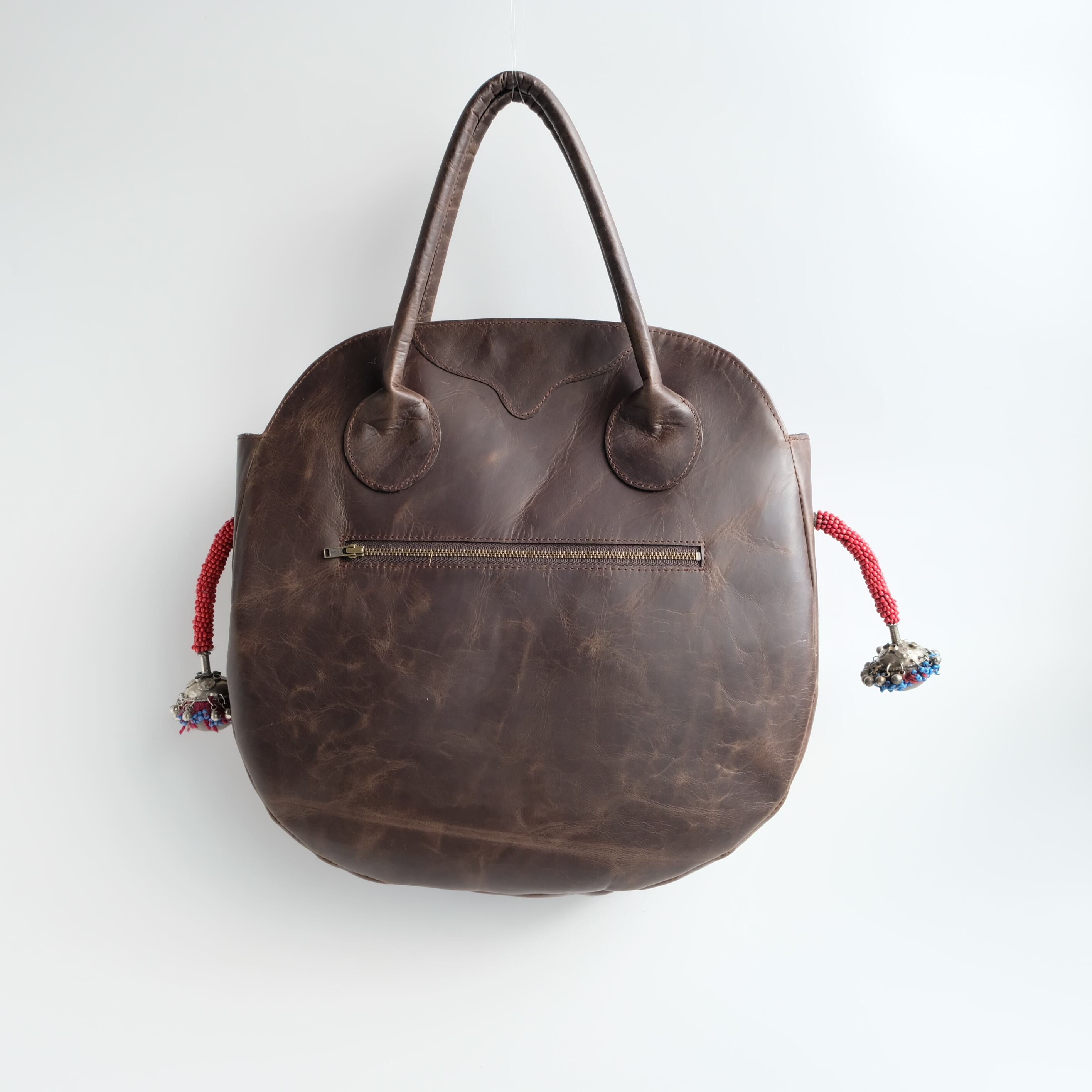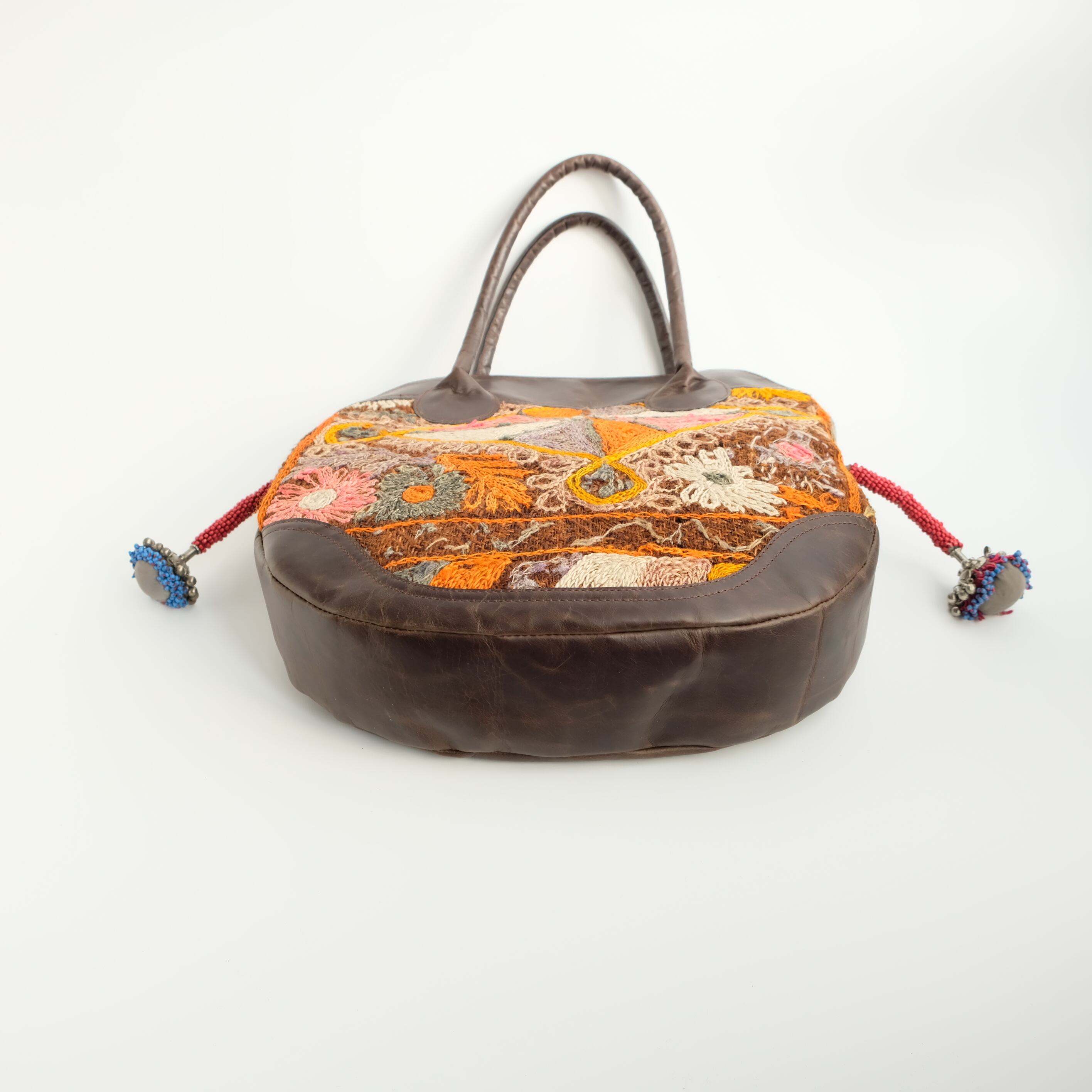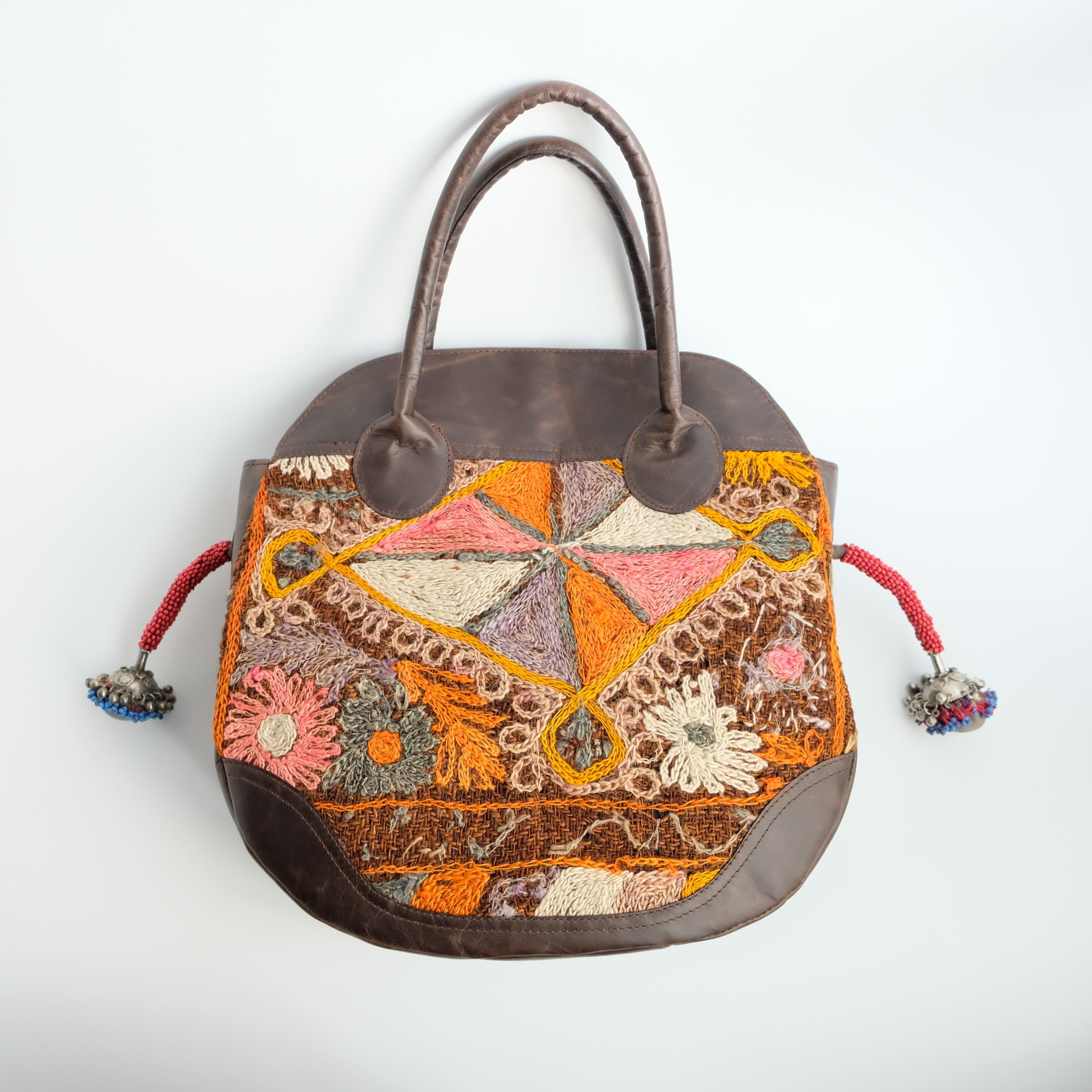 ブラウンベースのレザーに、贅沢にあしらったオールドキリムが目を惹きます。両サイドのビーズチャームがユニークなポイント