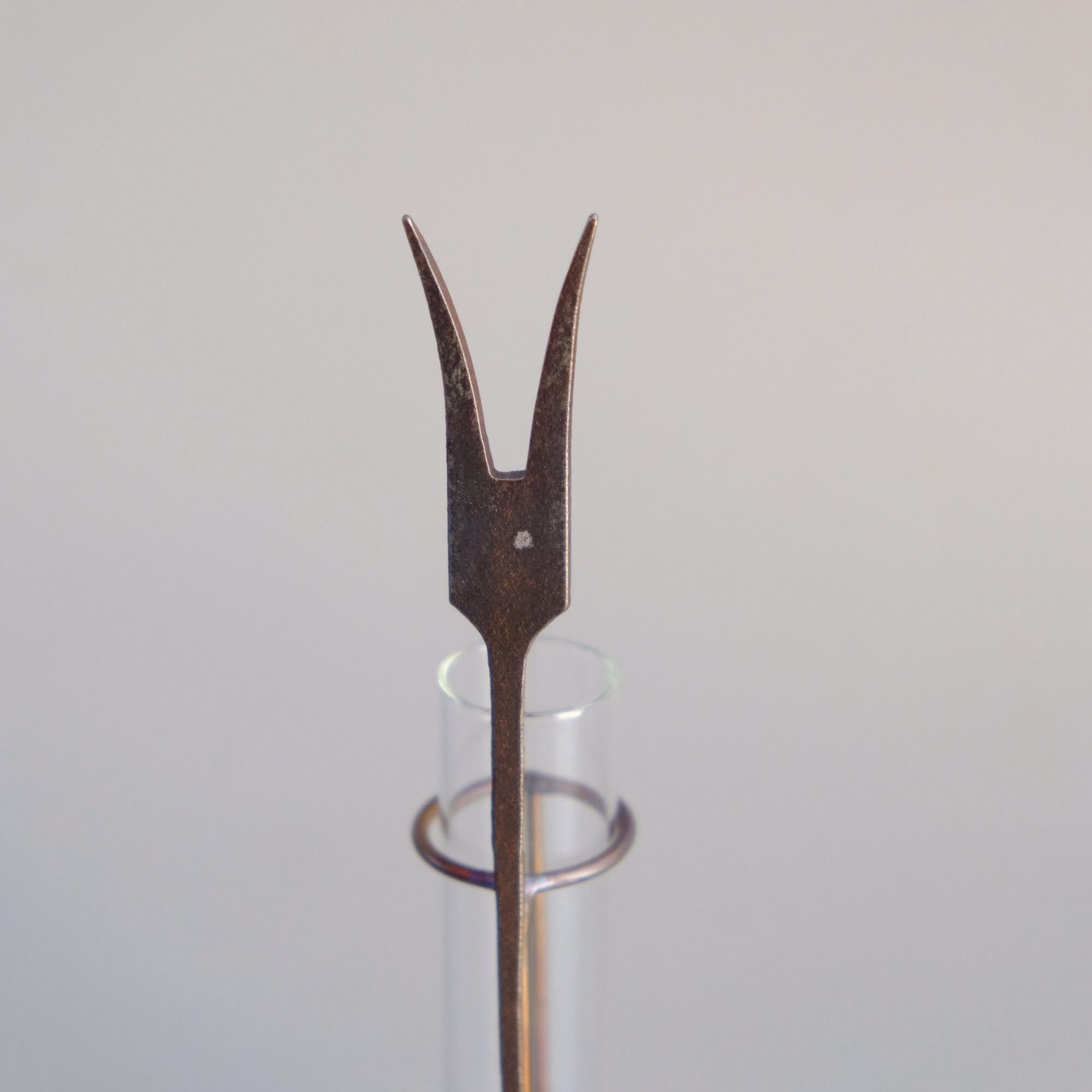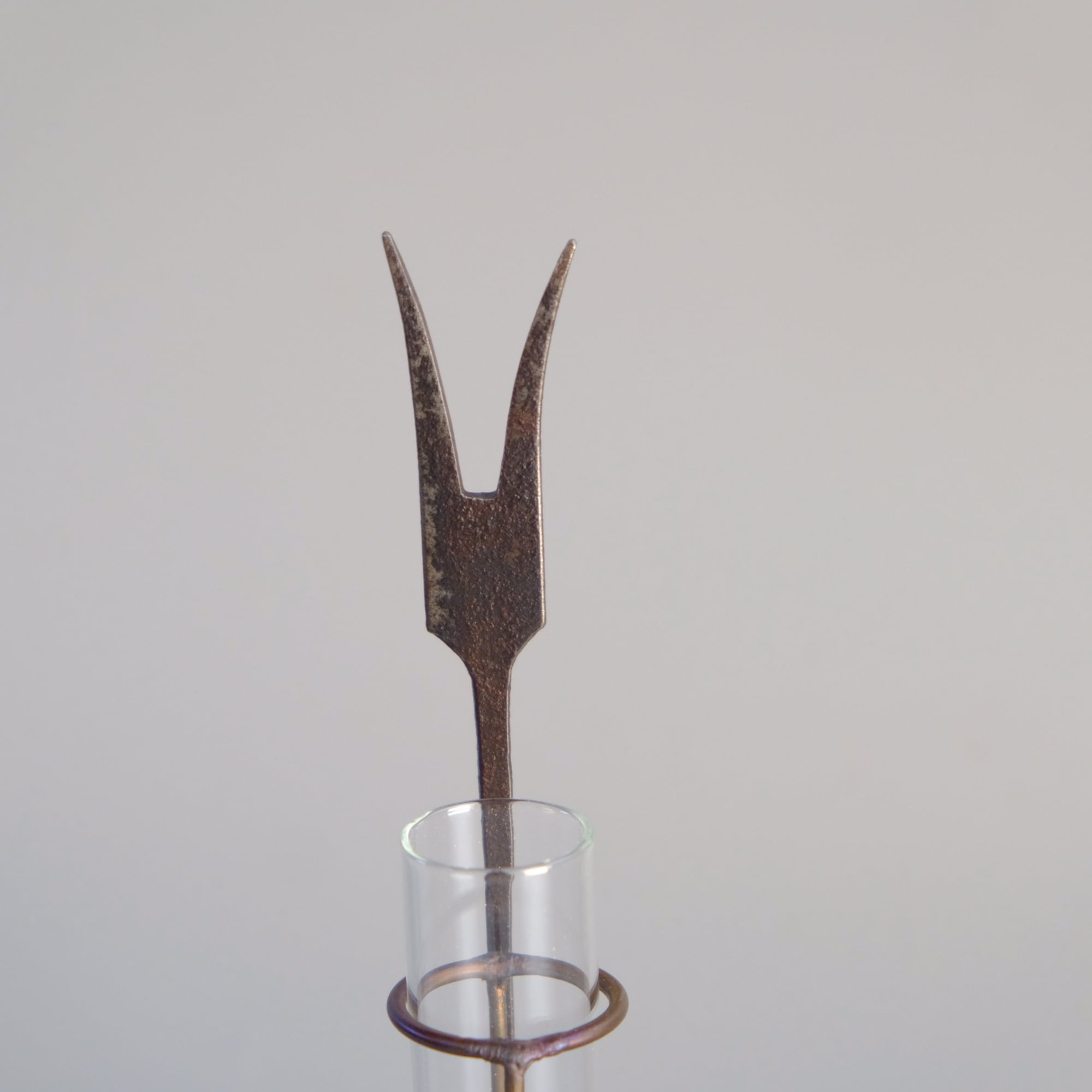 古物の矢じりを装飾した小さなガラスの一輪挿しです。