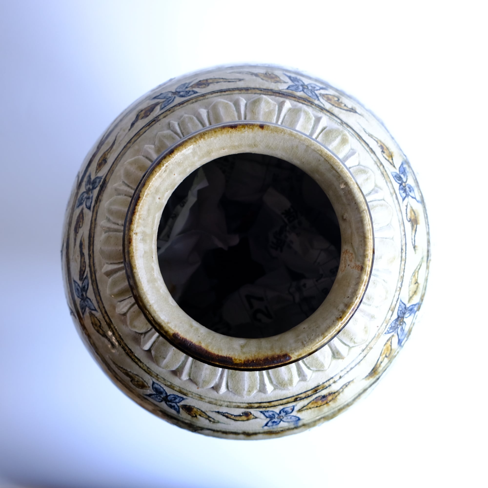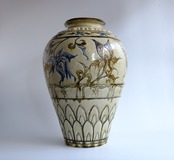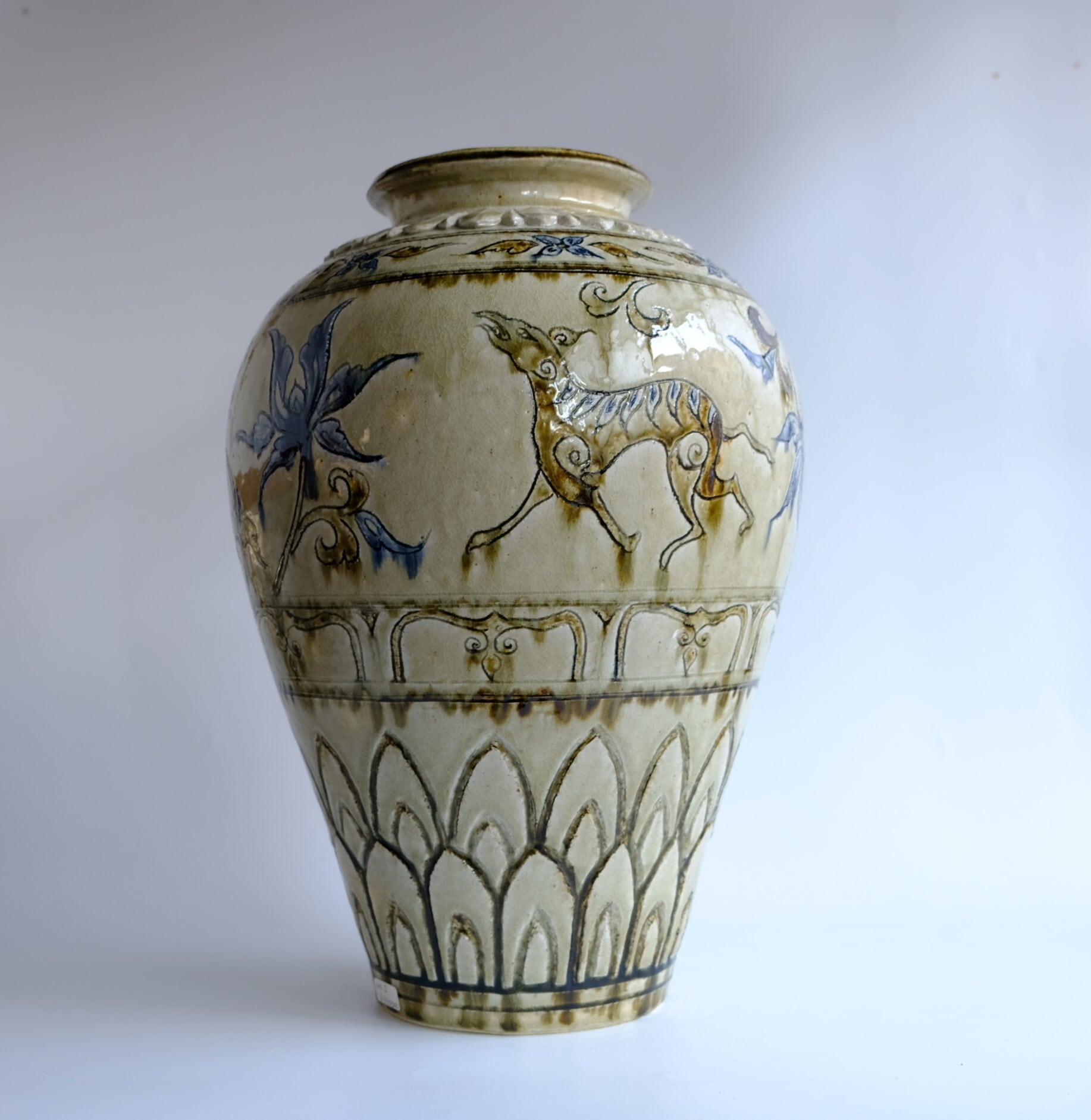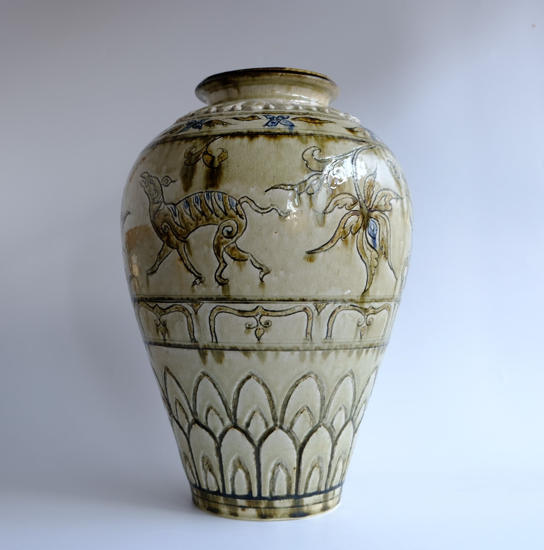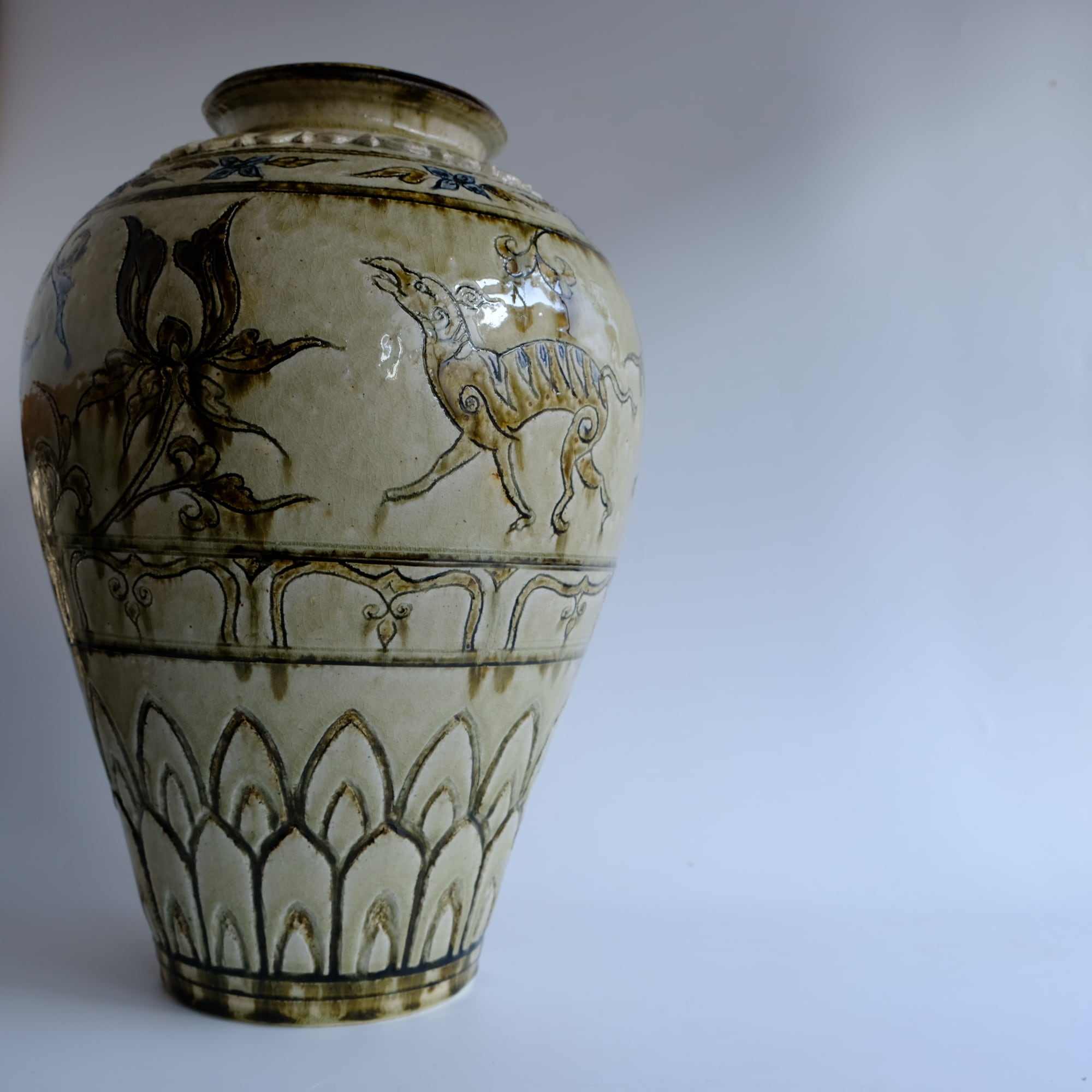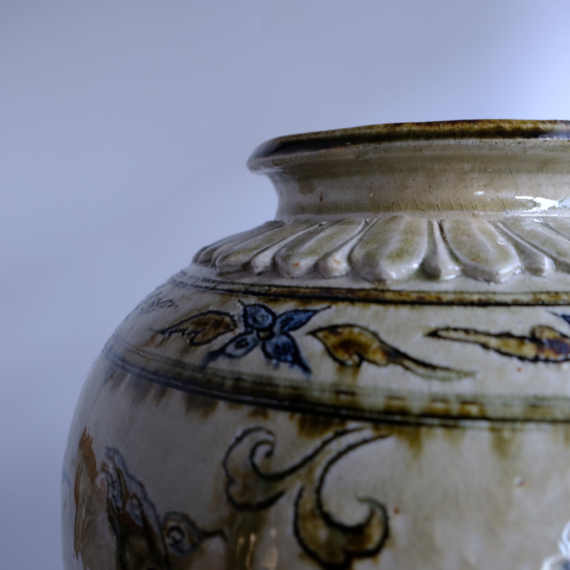 1 灰釉鉄彩連弁壺 藤田佳三 Ashed glaze iron-decorated lotus-petal desined jar by Keizo Fujita