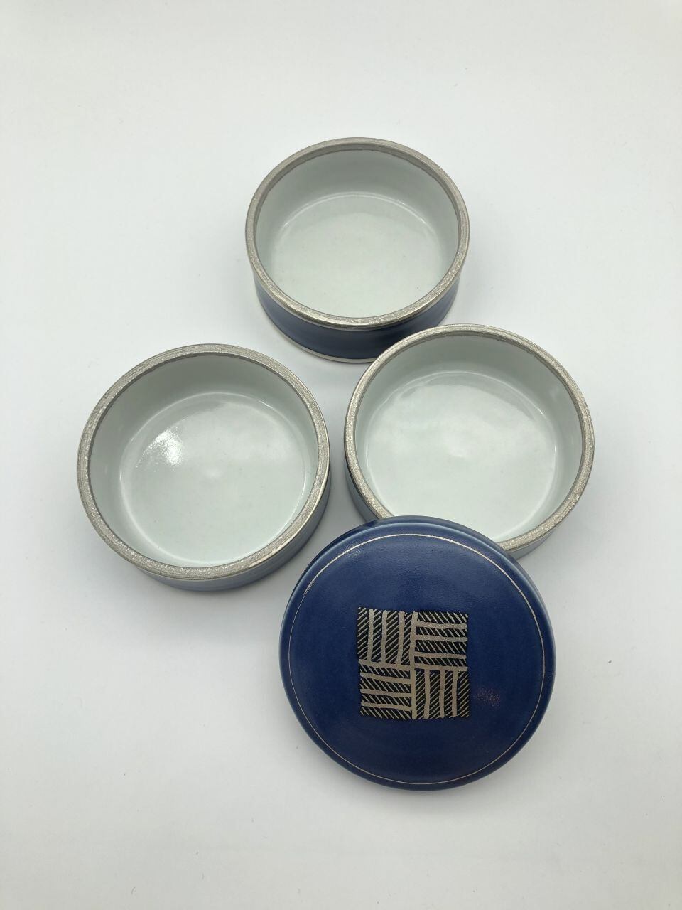 美しい瑠璃色に銀彩がほどこされた三段の小重です。